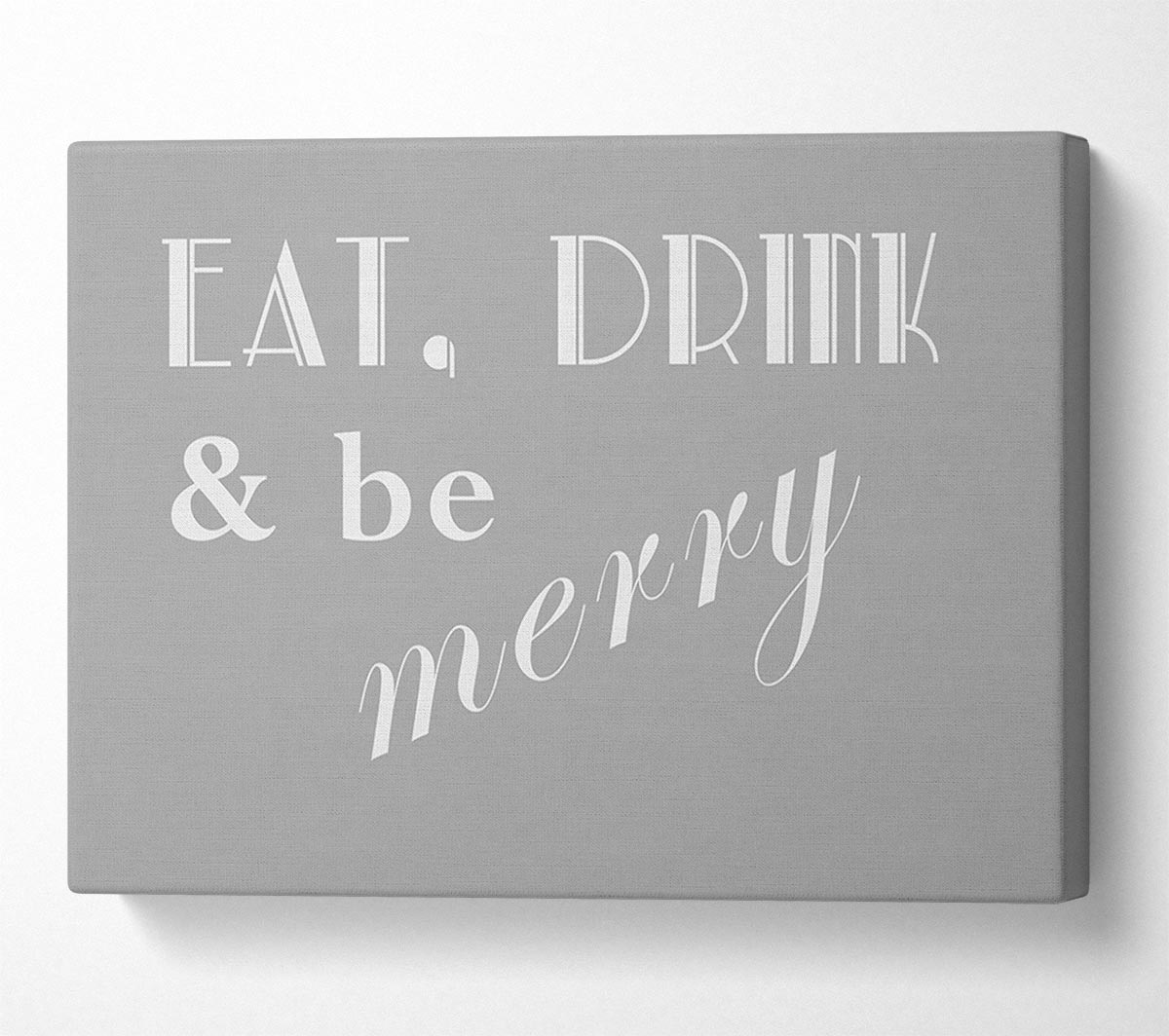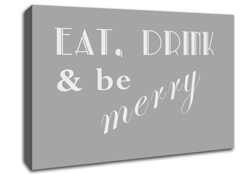 Kitchen Quote Eat Drink n Be Merry Grey White Canvas Print handmade in the UK. Stretched over a 2 inch thick wooden box frame, ready to hang on your wall.