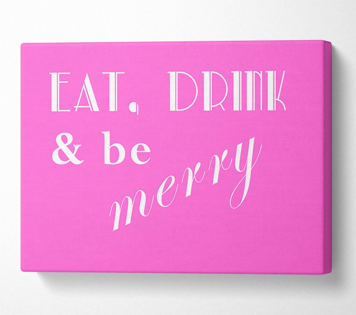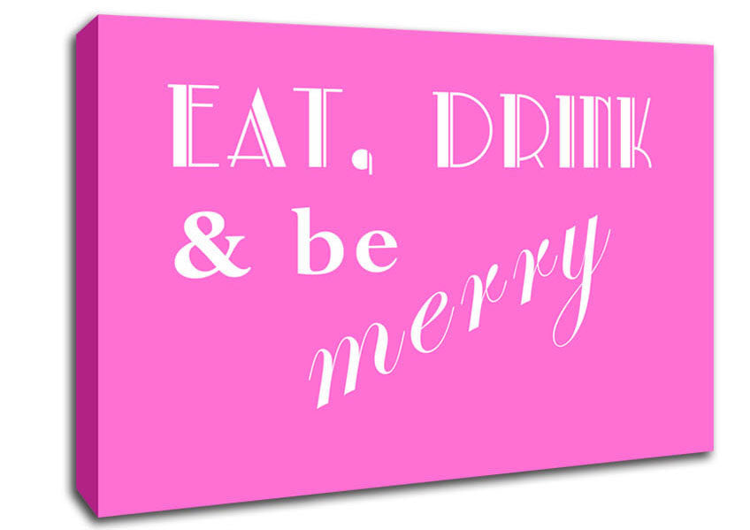 Kitchen Quote Eat Drink n Be Merry Vivid Pink Canvas Print handmade in the UK. Stretched over a 2 inch thick wooden box frame, ready to hang on your wall.