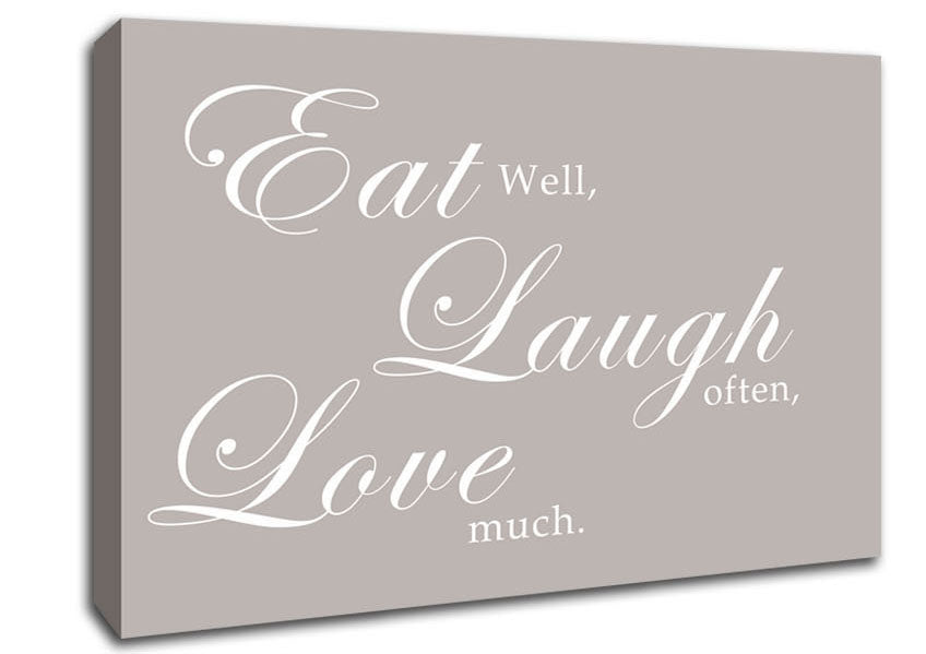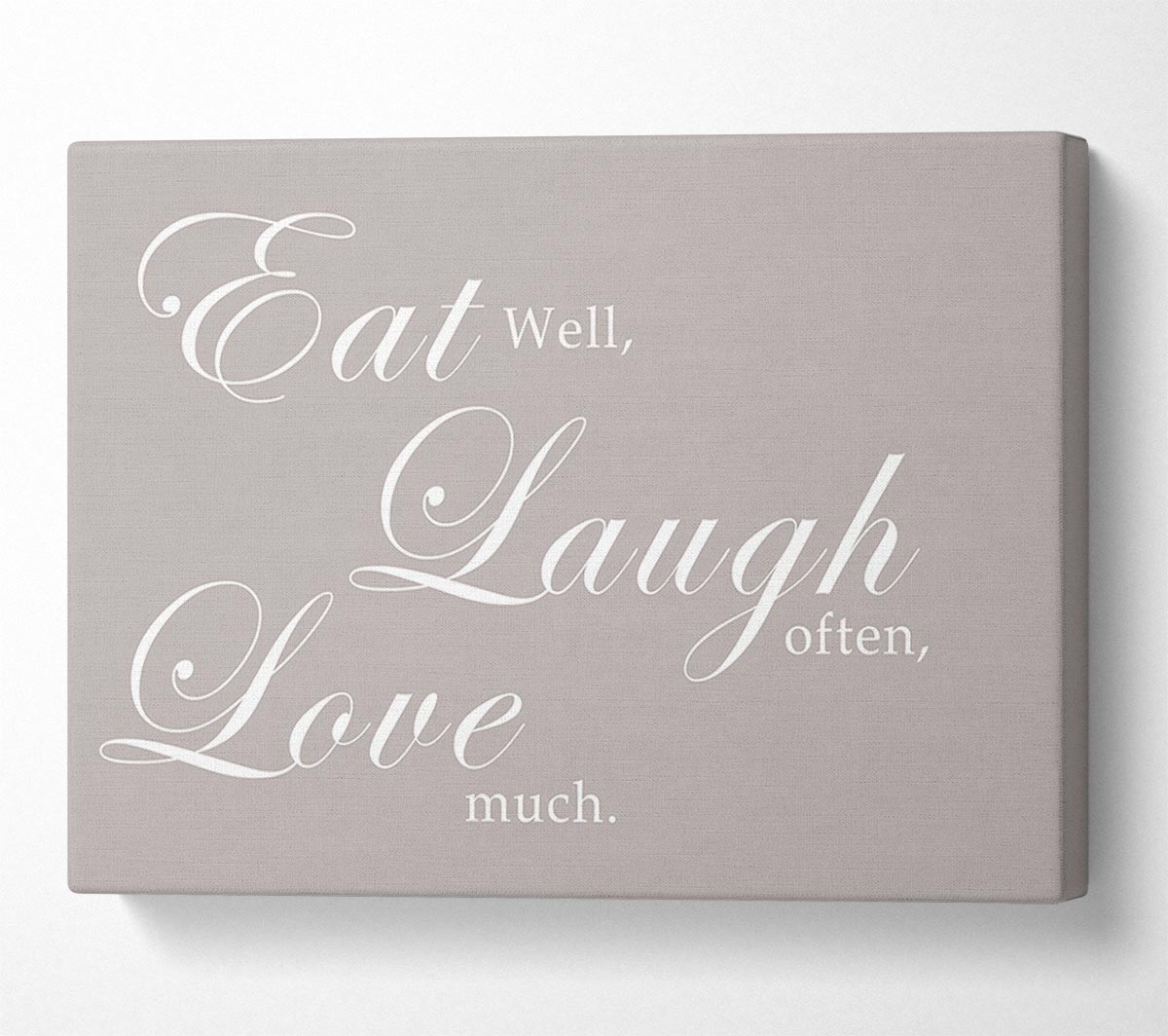 Kitchen Quote Eat Laugh Love Beige Canvas Print handmade in the UK. Stretched over a 2 inch thick wooden box frame, ready to hang on your wall.