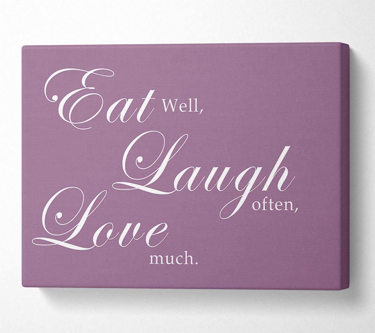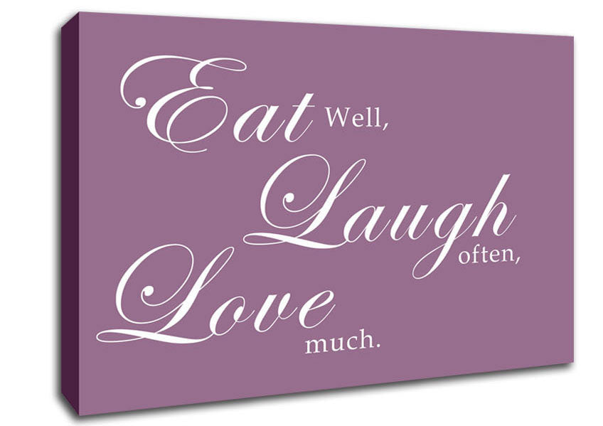 Kitchen Quote Eat Laugh Love Dusty Pink Canvas Print handmade in the UK. Stretched over a 2 inch thick wooden box frame, ready to hang on your wall.
