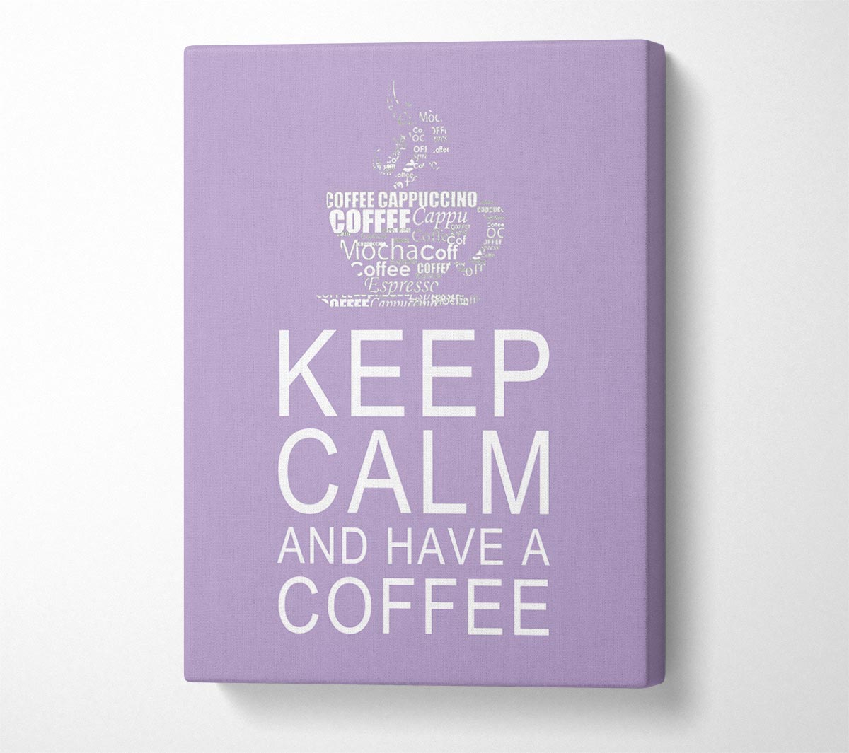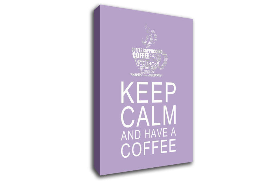 Kitchen Quote Keep Calm And Have A Coffee Lilac Canvas Print handmade in the UK. Stretched over a 2 inch thick wooden box frame, ready to hang on your wall.