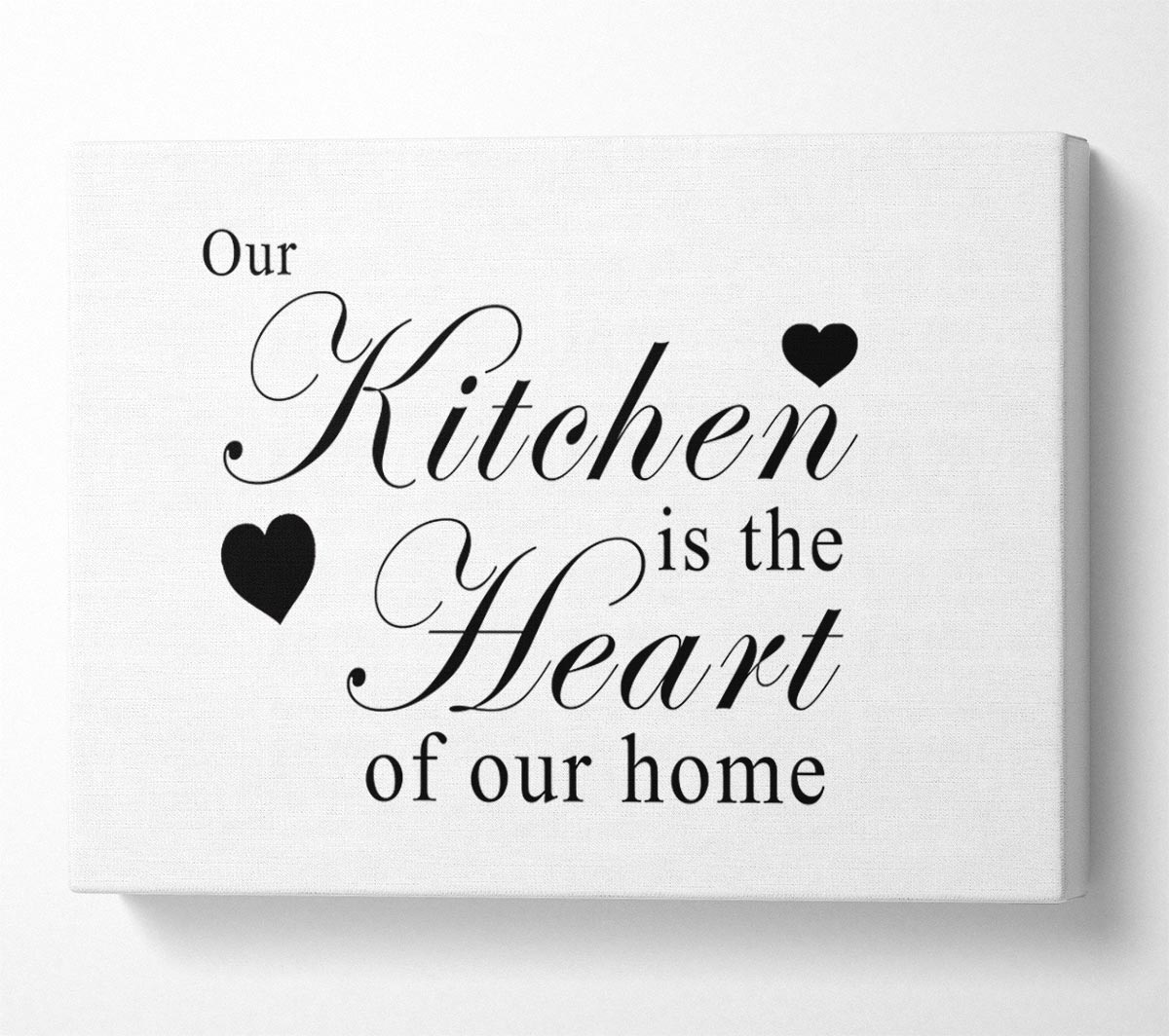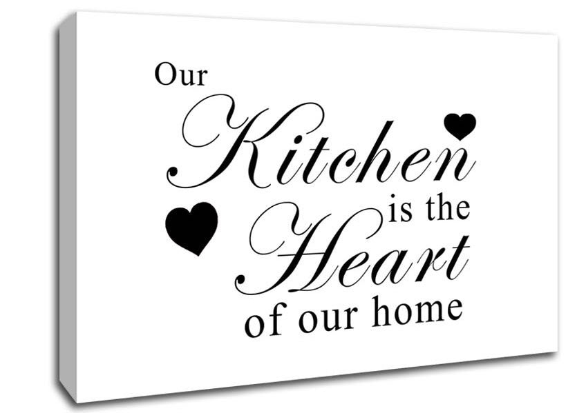 Kitchen Quote Our Kitchen Is The Heart White Canvas Print handmade in the UK. Stretched over a 2 inch thick wooden box frame, ready to hang on your wall.