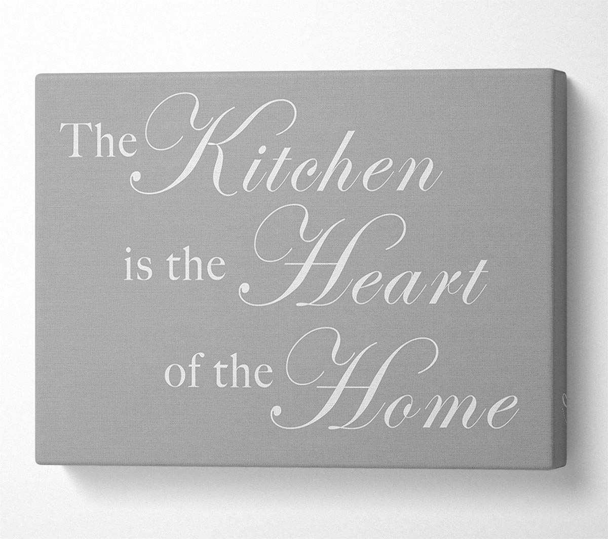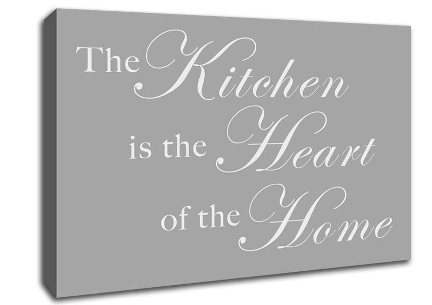 Kitchen Quote The Kitchen Is The Heart Of The Home Grey White Canvas Print handmade in the UK. Stretched over a 2 inch thick wooden box frame, ready to hang on your wall.