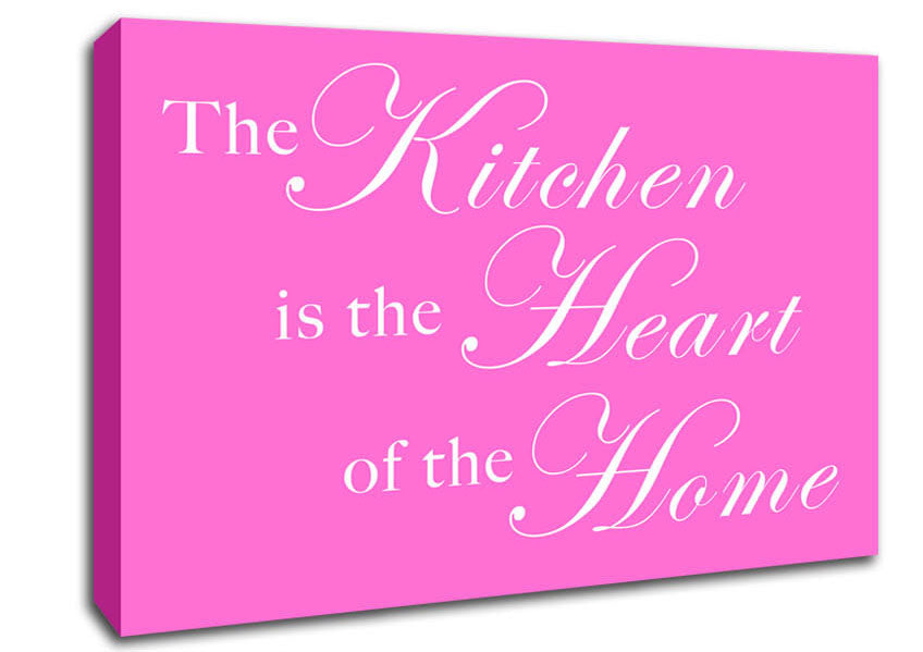 Kitchen Quote The Kitchen Is The Heart Of The Home Vivid Pink Canvas Print handmade in the UK. Stretched over a 2 inch thick wooden box frame, ready to hang on your wall.