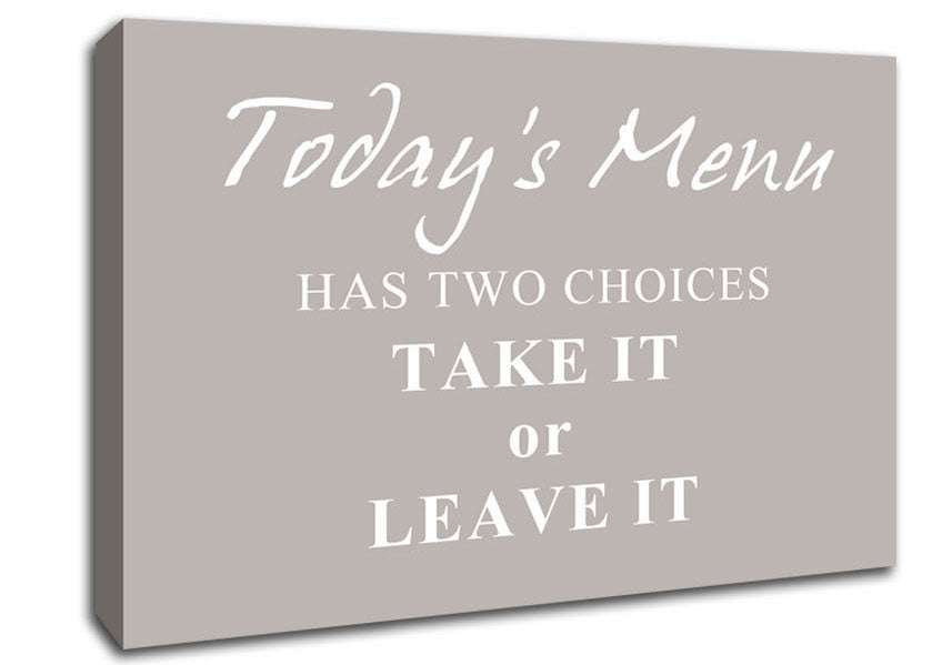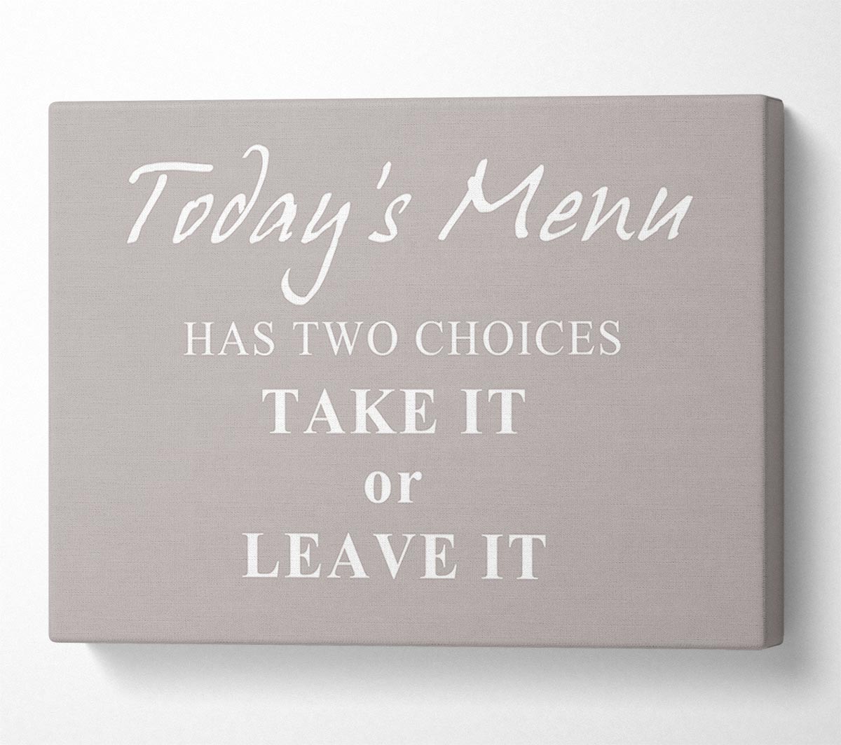 Kitchen Quote Todays Menu Has Two Choices Beige Canvas Print handmade in the UK. Stretched over a 2 inch thick wooden box frame, ready to hang on your wall.