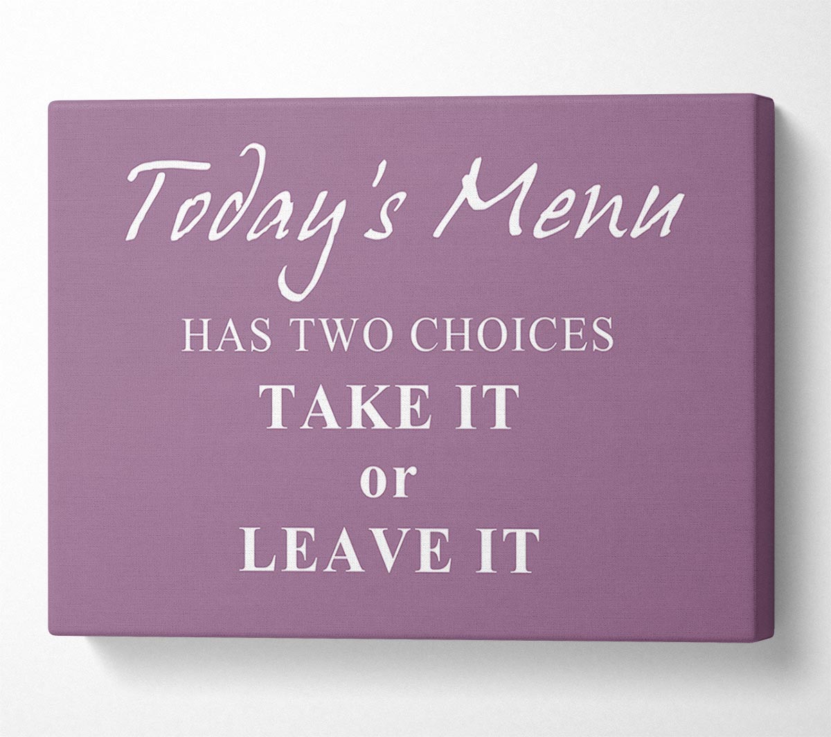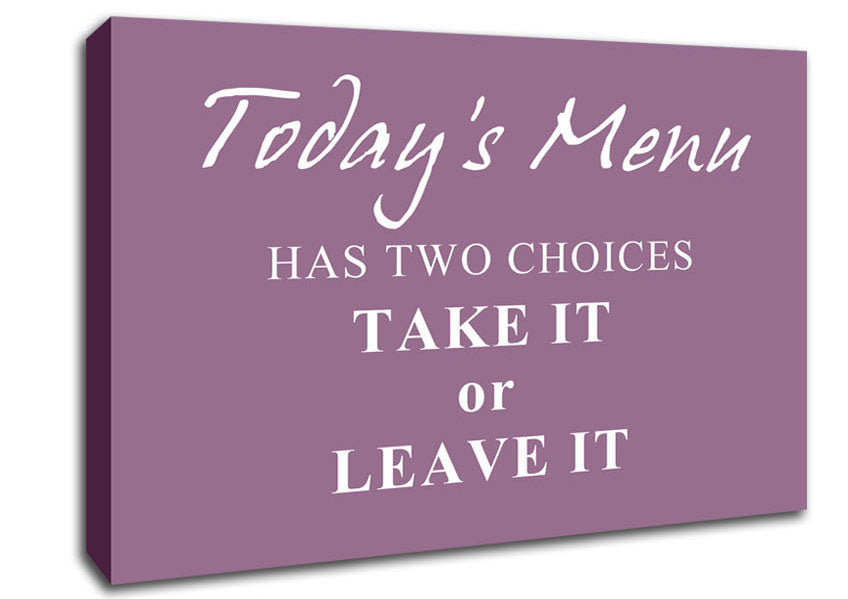 Kitchen Quote Todays Menu Has Two Choices Dusty Pink Canvas Print handmade in the UK. Stretched over a 2 inch thick wooden box frame, ready to hang on your wall.