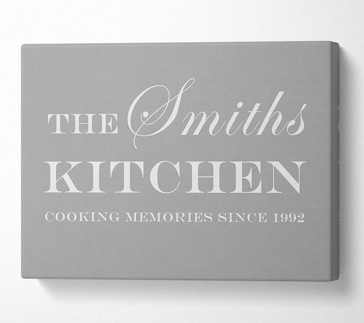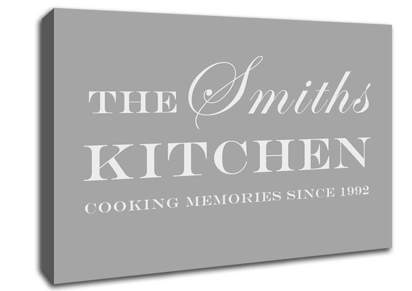 Kitchen Quote Your Family Name And Date Kitchen Grey White Canvas Print handmade in the UK. Stretched over a 2 inch thick wooden box frame, ready to hang on your wall.