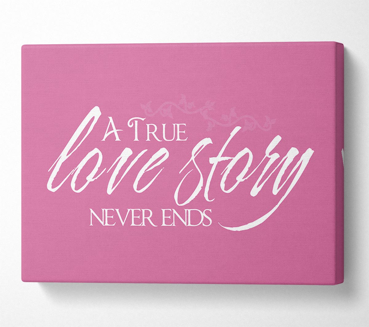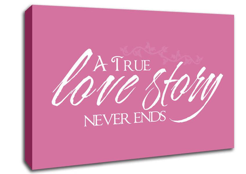 Love Quote A True Love Story Never Ends Pink Canvas Print handmade in the UK. Stretched over a 2 inch thick wooden box frame, ready to hang on your wall.