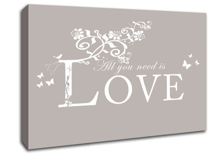 Love Quote All You Need Is Love Beige Canvas Print handmade in the UK. Stretched over a 2 inch thick wooden box frame, ready to hang on your wall.