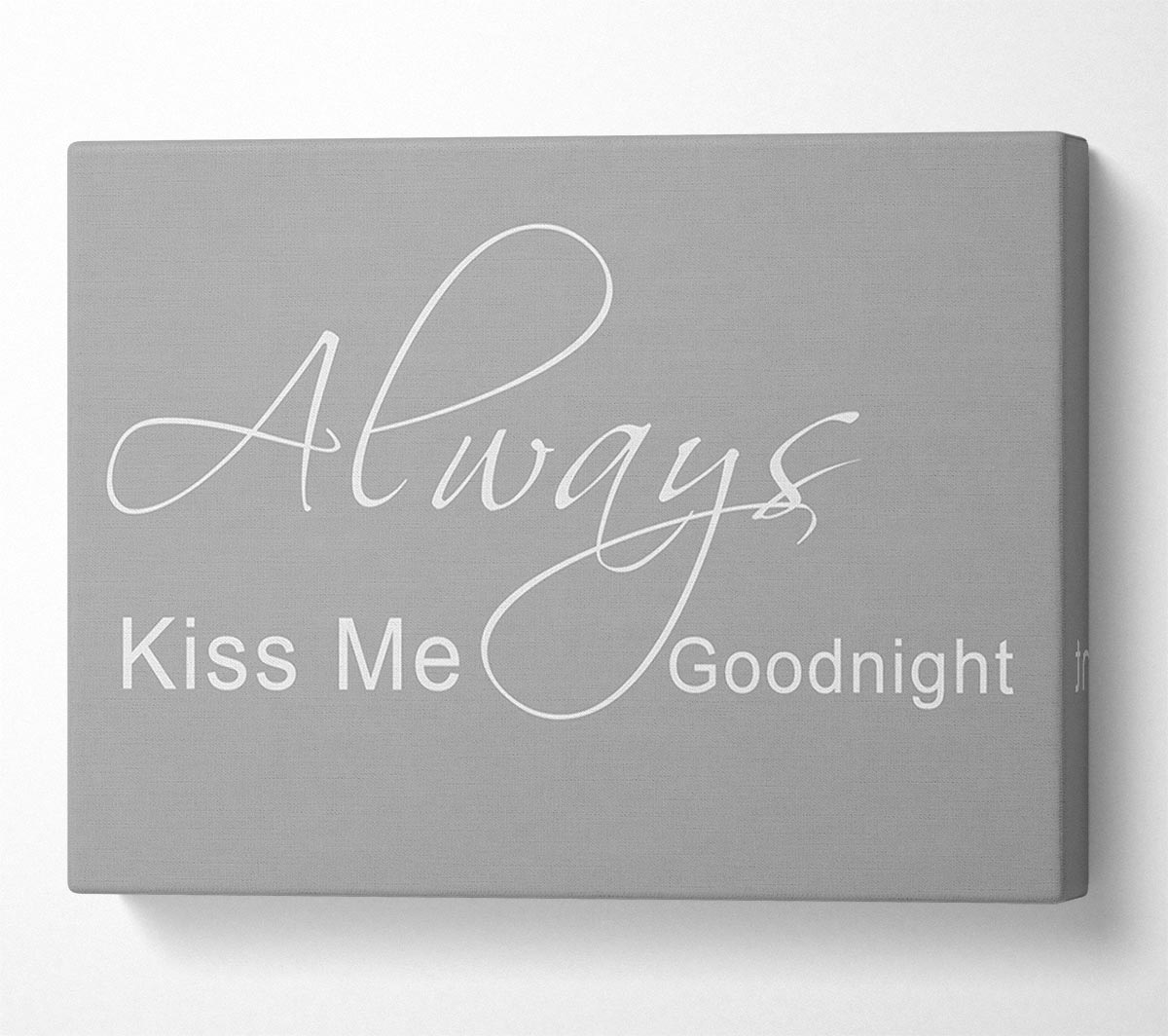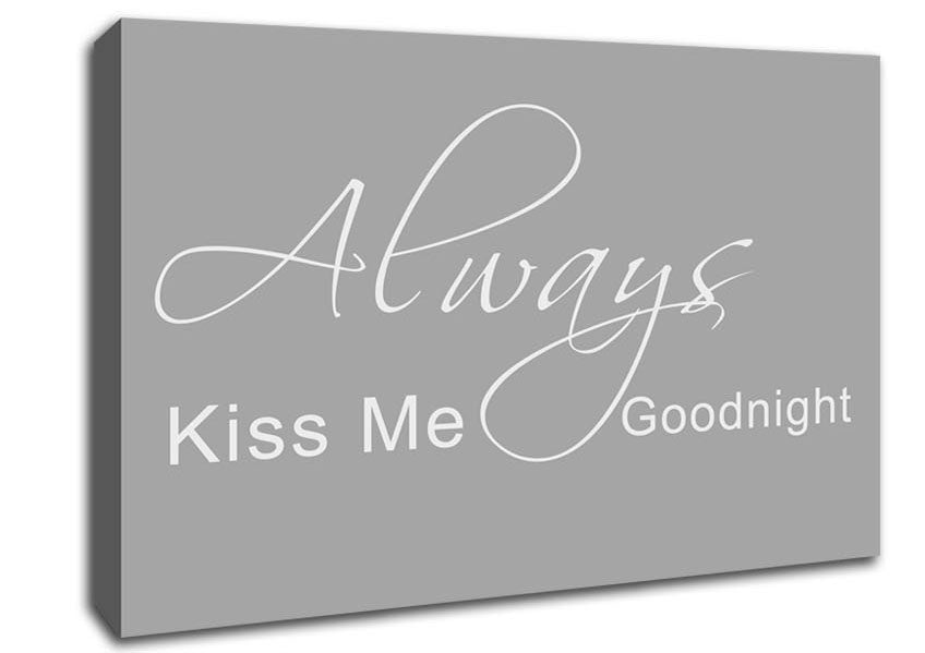 Love Quote Always Kiss Me Goodnight 2 Grey White Canvas Print handmade in the UK. Stretched over a 2 inch thick wooden box frame, ready to hang on your wall.