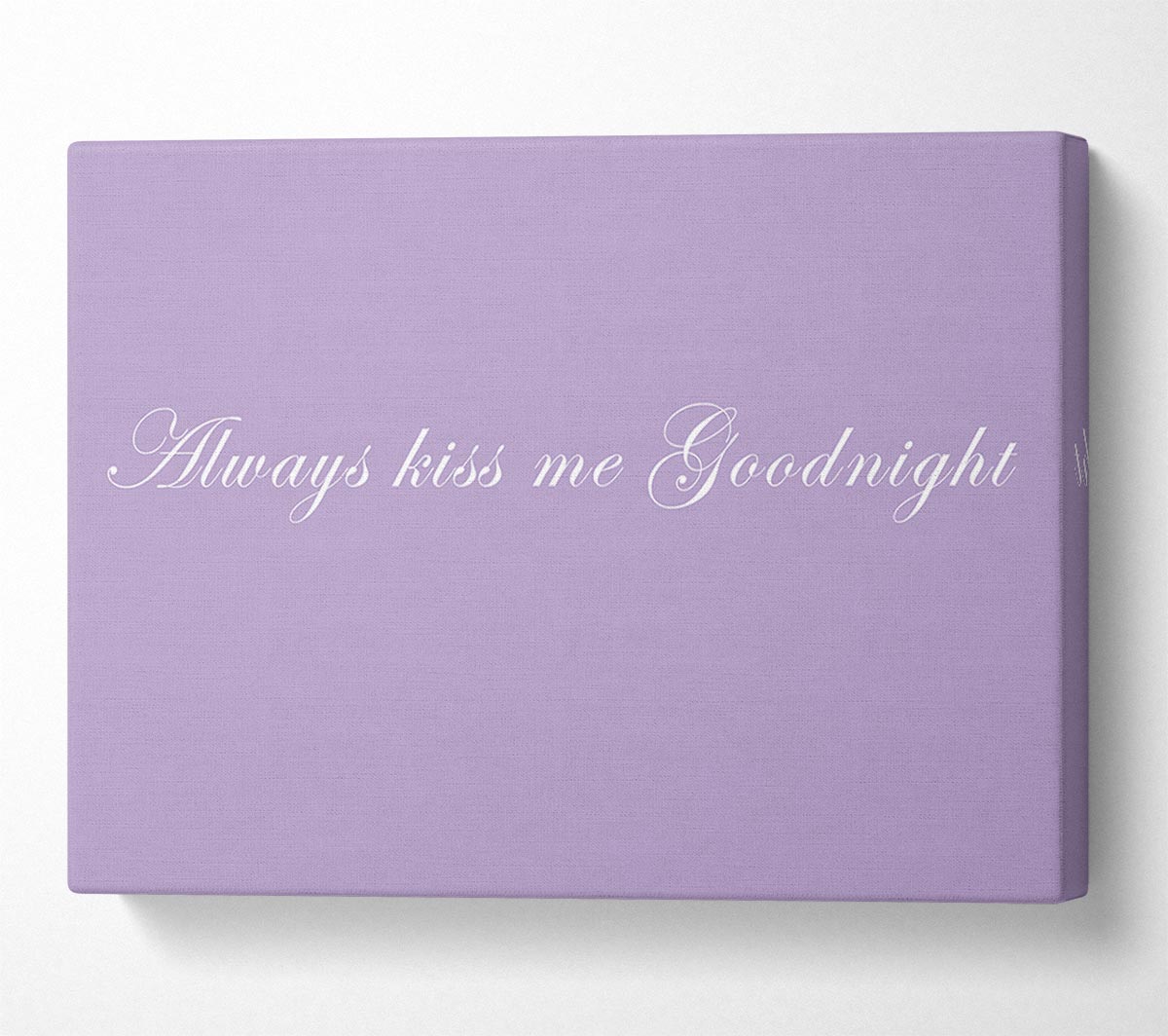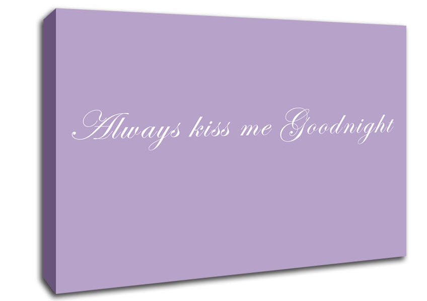 Love Quote Always Kiss Me Goodnight Lilac Canvas Print handmade in the UK. Stretched over a 2 inch thick wooden box frame, ready to hang on your wall.