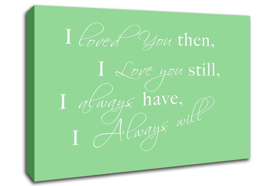 Love Quote I Loved You Then I Love You Still Green Canvas Print handmade in the UK. Stretched over a 2 inch thick wooden box frame, ready to hang on your wall.