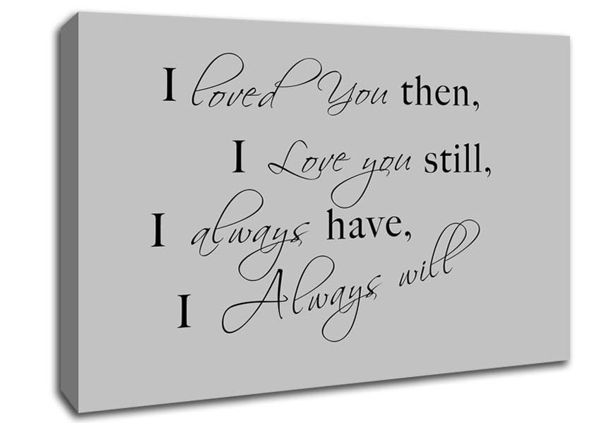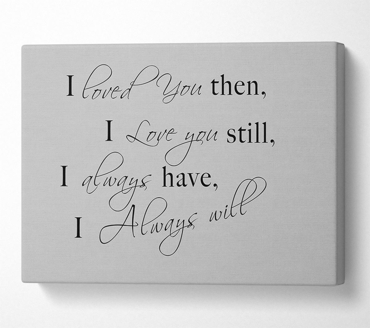 Love Quote I Loved You Then I Love You Still Grey Canvas Print handmade in the UK. Stretched over a 2 inch thick wooden box frame, ready to hang on your wall.