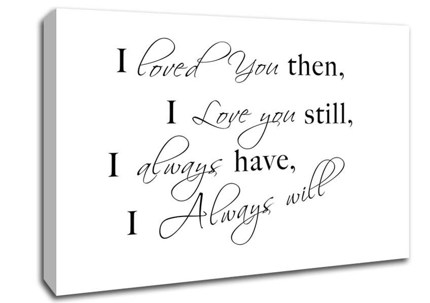 Love Quote I Loved You Then I Love You Still White Canvas Print handmade in the UK. Stretched over a 2 inch thick wooden box frame, ready to hang on your wall.