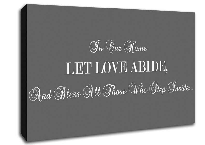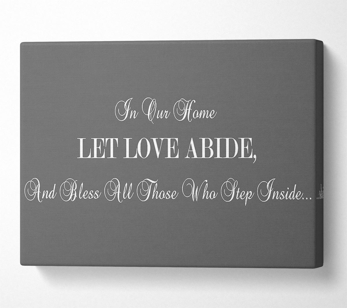 Love Quote In Our Home Let Love Abide Grey Canvas Print handmade in the UK. Stretched over a 2 inch thick wooden box frame, ready to hang on your wall.