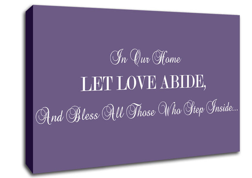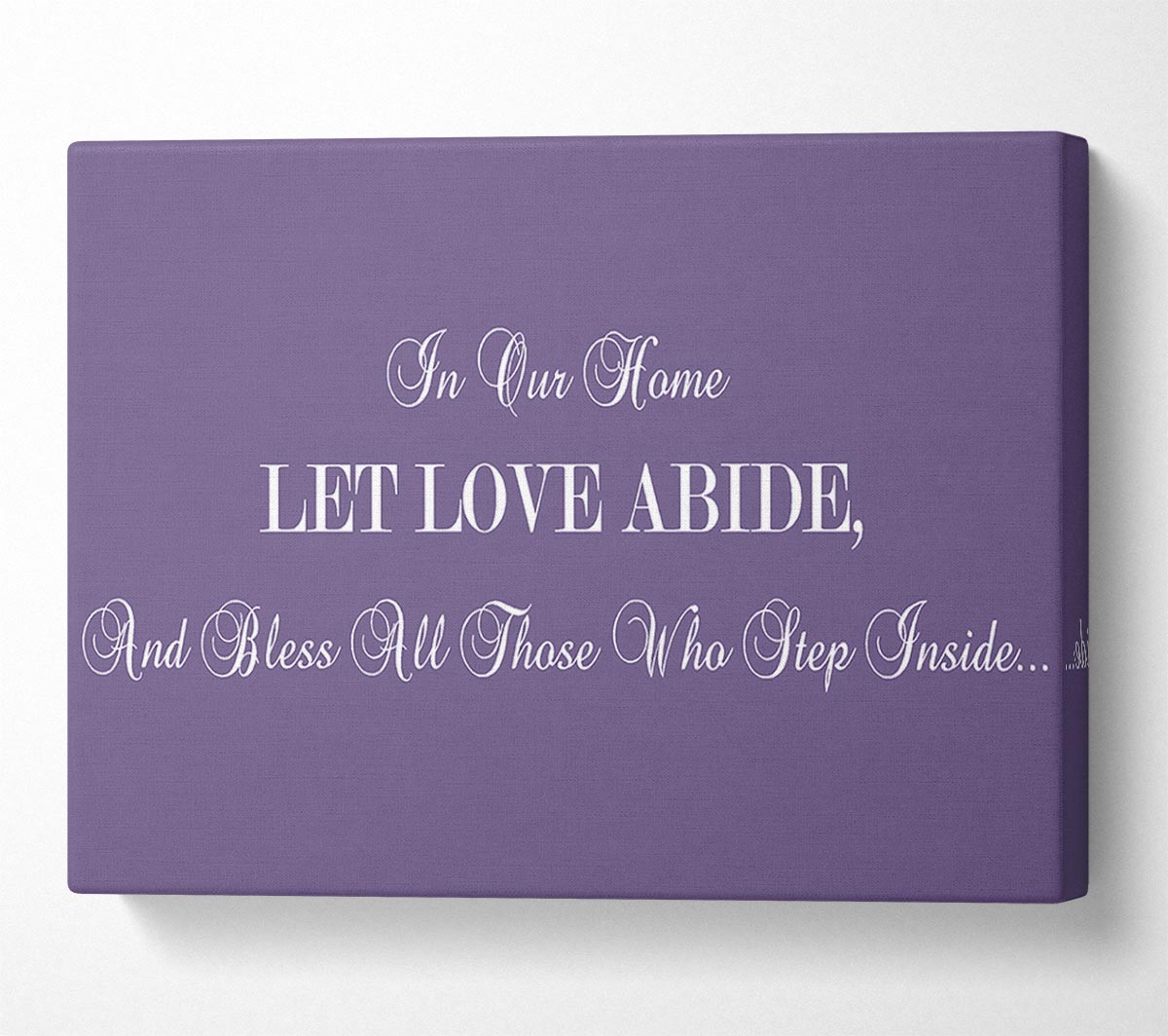 Love Quote In Our Home Let Love Abide Lilac Canvas Print handmade in the UK. Stretched over a 2 inch thick wooden box frame, ready to hang on your wall.