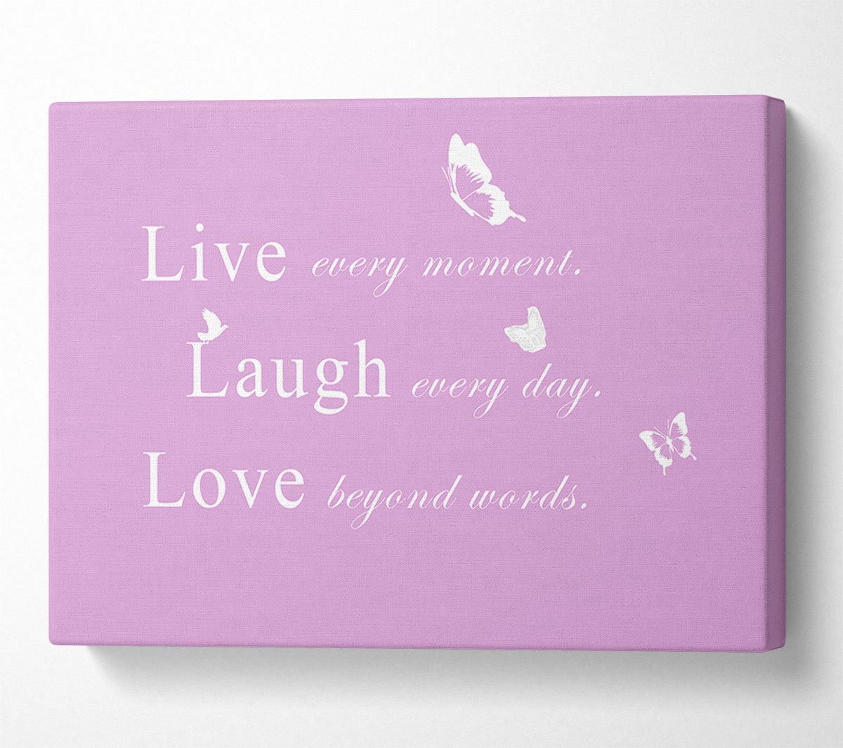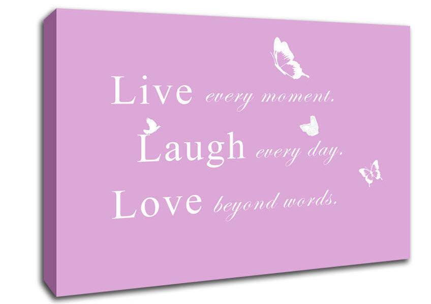 Love Quote Live Every Moment Pink Canvas Print handmade in the UK. Stretched over a 2 inch thick wooden box frame, ready to hang on your wall.