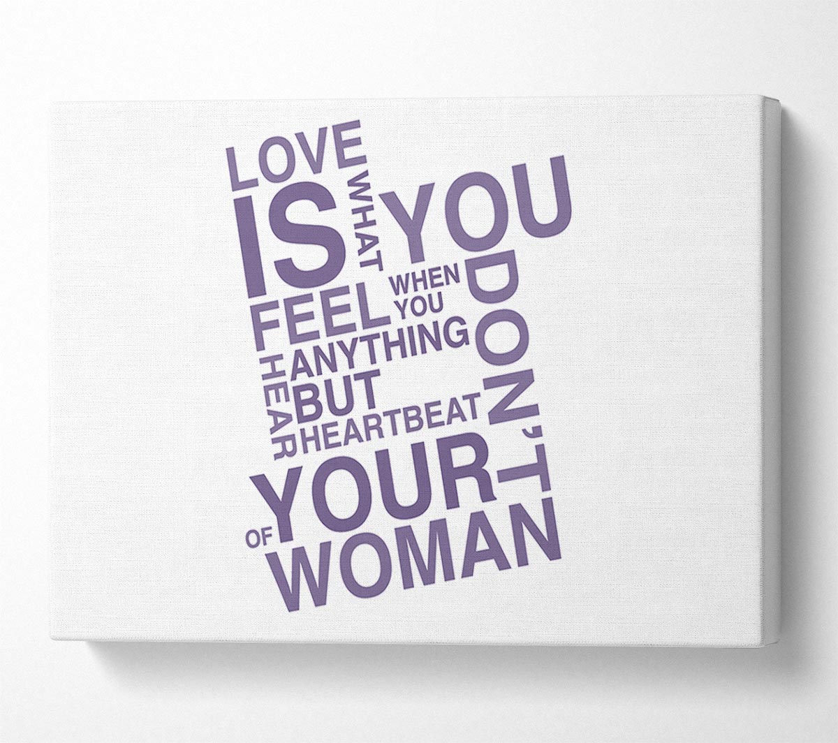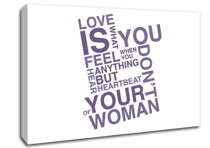 Love Quote Love Is What You Feel Lilac Canvas Print handmade in the UK. Stretched over a 2 inch thick wooden box frame, ready to hang on your wall.