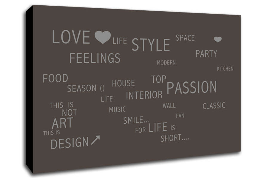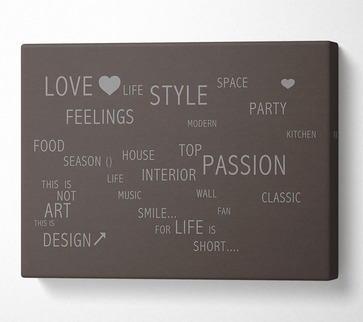 Love Quote Love Life Chocolate Canvas Print handmade in the UK. Stretched over a 2 inch thick wooden box frame, ready to hang on your wall.