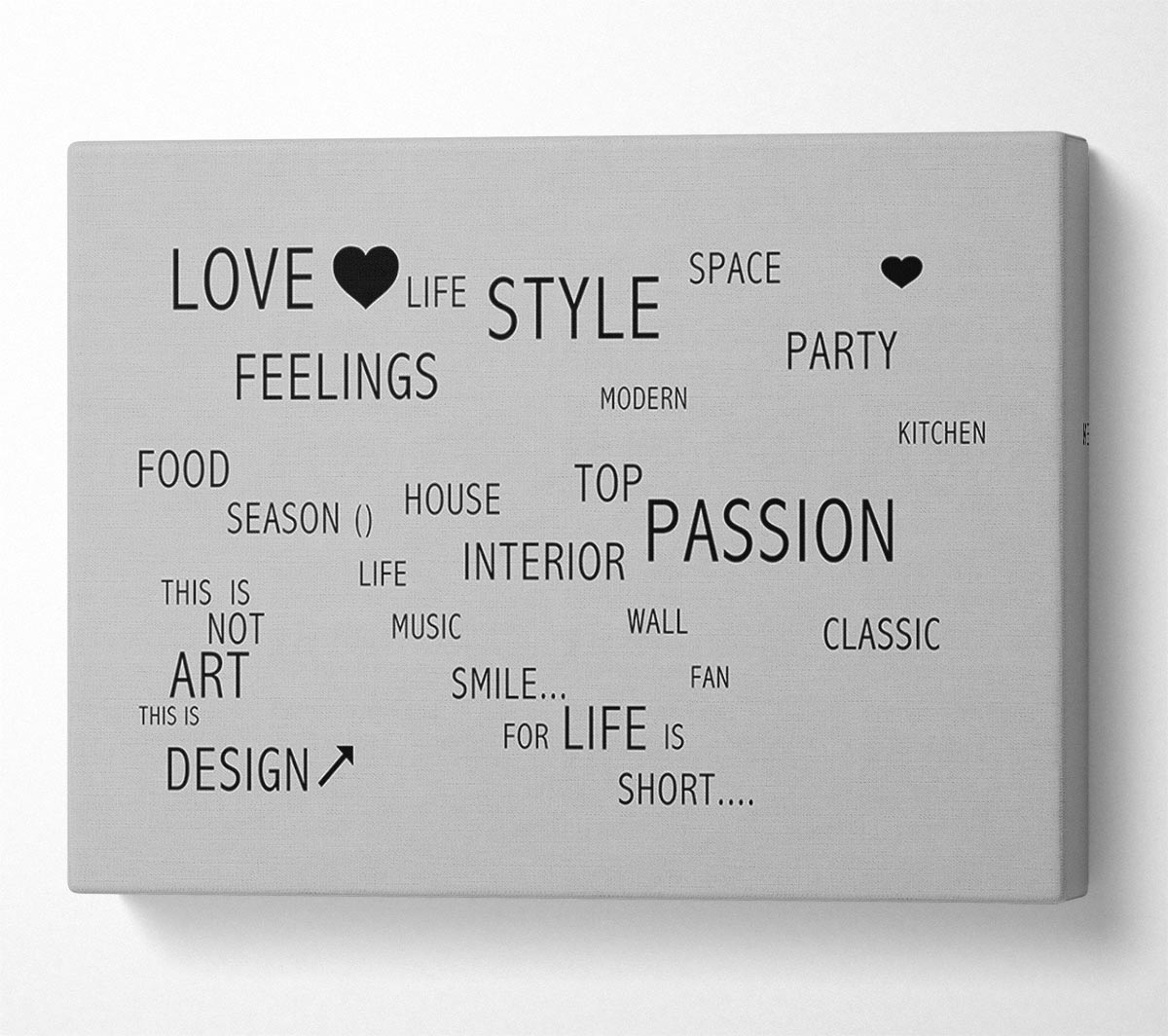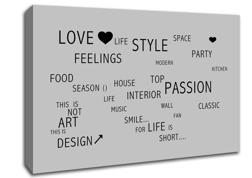 Love Quote Love Life Grey Canvas Print handmade in the UK. Stretched over a 2 inch thick wooden box frame, ready to hang on your wall.