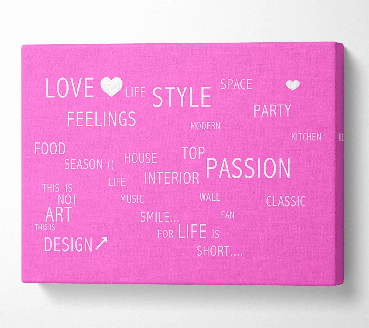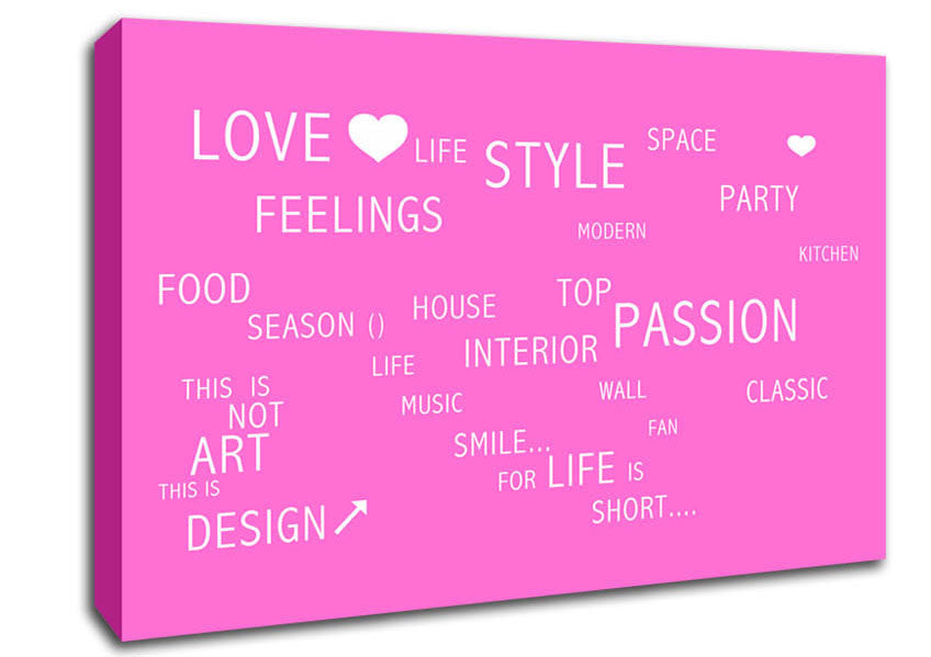 Love Quote Love Life Vivid Pink Canvas Print handmade in the UK. Stretched over a 2 inch thick wooden box frame, ready to hang on your wall.