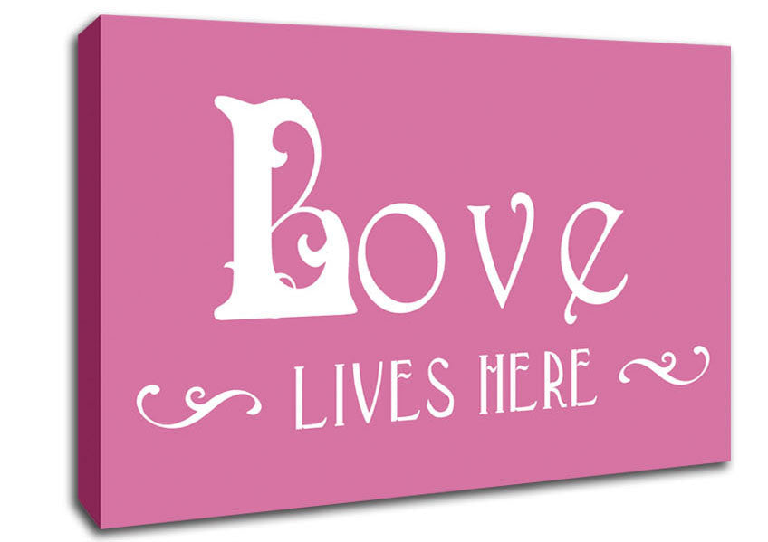 Love Quote Love Lives Here Vines Pink Canvas Print handmade in the UK. Stretched over a 2 inch thick wooden box frame, ready to hang on your wall.