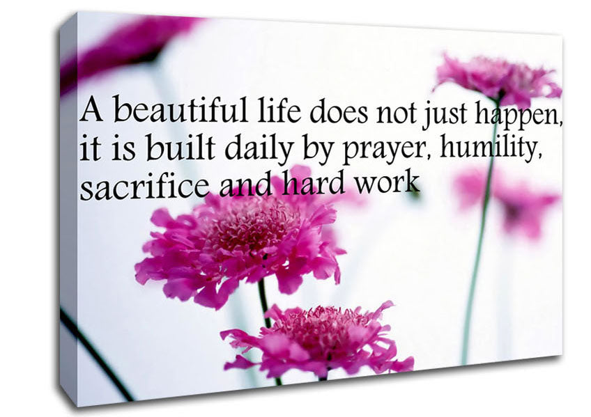 Motivational Quote A Beautiful Life Does Not Just Happen Canvas Print handmade in the UK. Stretched over a 2 inch thick wooden box frame, ready to hang on your wall.