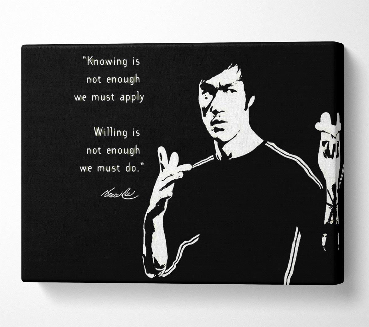 Motivational Quote Bruce Lee Knowing Is Not Enough Canvas Print handmade in the UK. Stretched over a 2 inch thick wooden box frame, ready to hang on your wall.