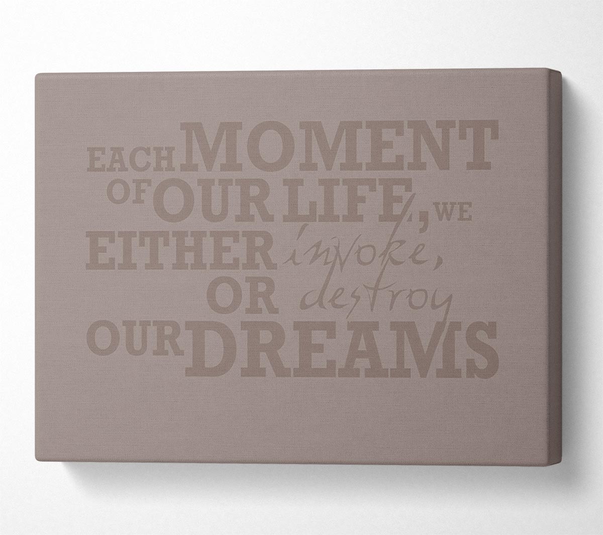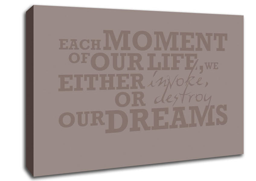 Motivational Quote Each Moment Of Our Life Beige Canvas Print handmade in the UK. Stretched over a 2 inch thick wooden box frame, ready to hang on your wall.