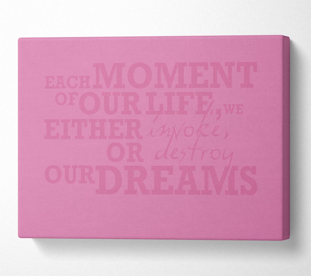 Motivational Quote Each Moment Of Our Life Pink Canvas Print handmade in the UK. Stretched over a 2 inch thick wooden box frame, ready to hang on your wall.