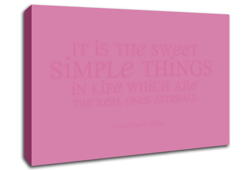 Motivational Quote Laura Wilder It Is The Sweet Simple Things Pink Canvas Print handmade in the UK. Stretched over a 2 inch thick wooden box frame, ready to hang on your wall.