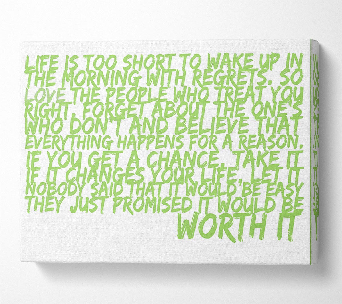 Motivational Quote Life Is Too Short Your Worth It Lime Green Canvas Print handmade in the UK. Stretched over a 2 inch thick wooden box frame, ready to hang on your wall.