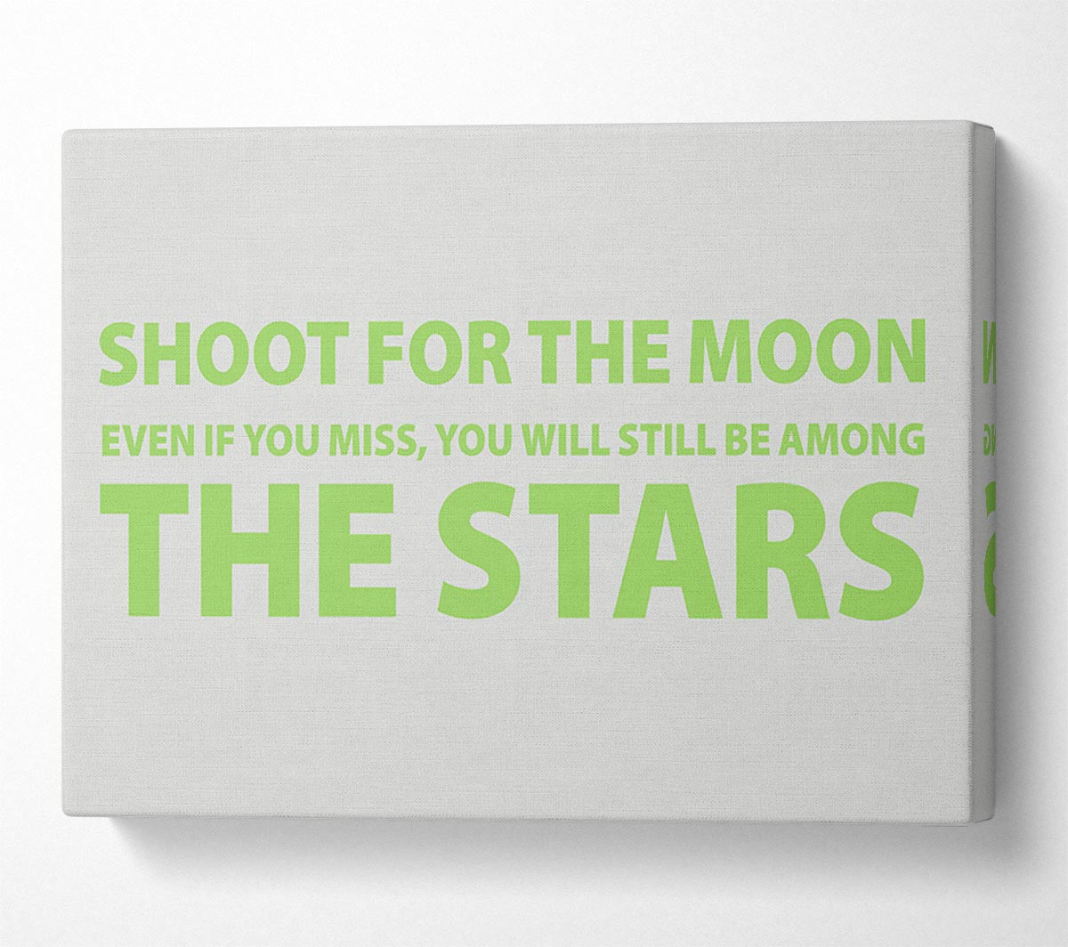 Motivational Quote Shoot For The Moon Lime Green Canvas Print handmade in the UK. Stretched over a 2 inch thick wooden box frame, ready to hang on your wall.