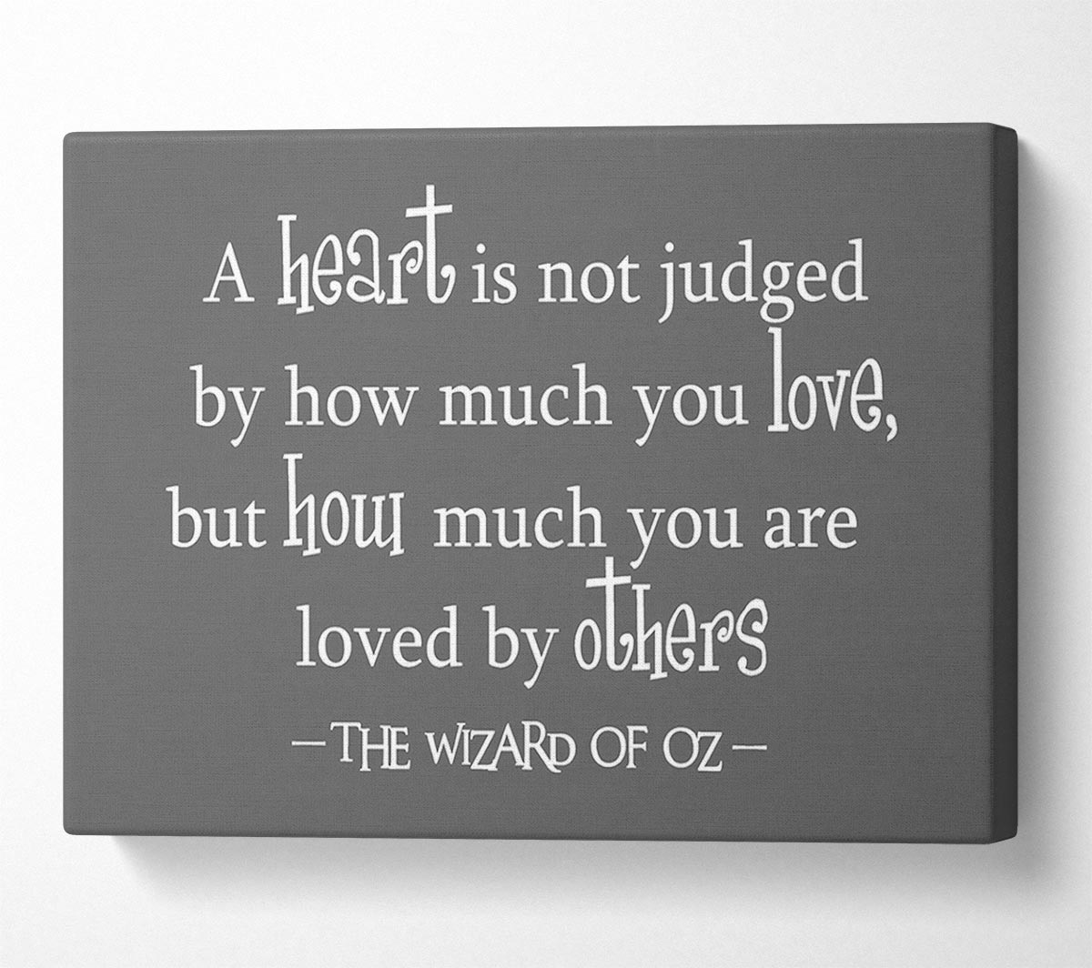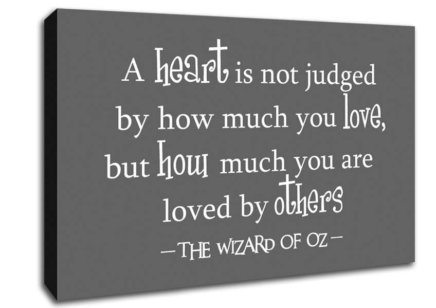 Movie Quote Wizard Of Oz A Heart Is Not Judged Grey Canvas Print handmade in the UK. Stretched over a 2 inch thick wooden box frame, ready to hang on your wall.