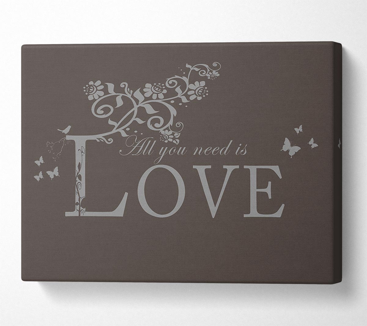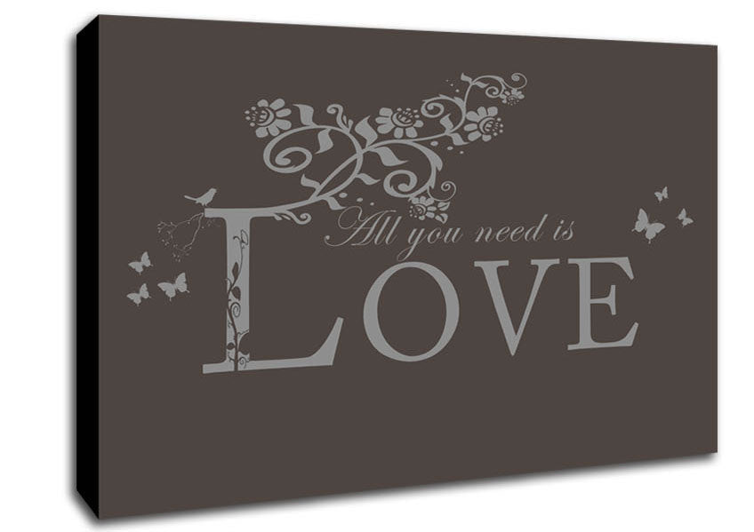Music Quote All You Need Is Love Chocolate Canvas Print handmade in the UK. Stretched over a 2 inch thick wooden box frame, ready to hang on your wall.