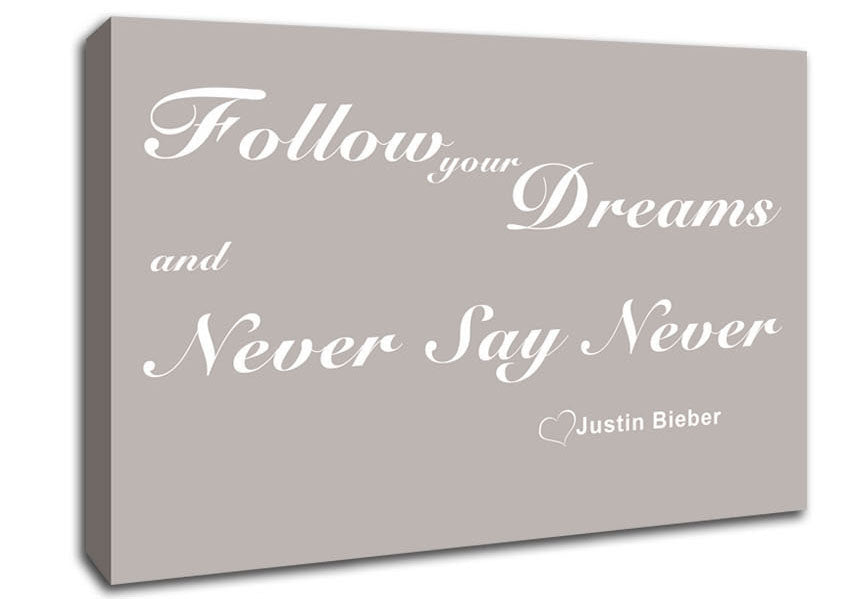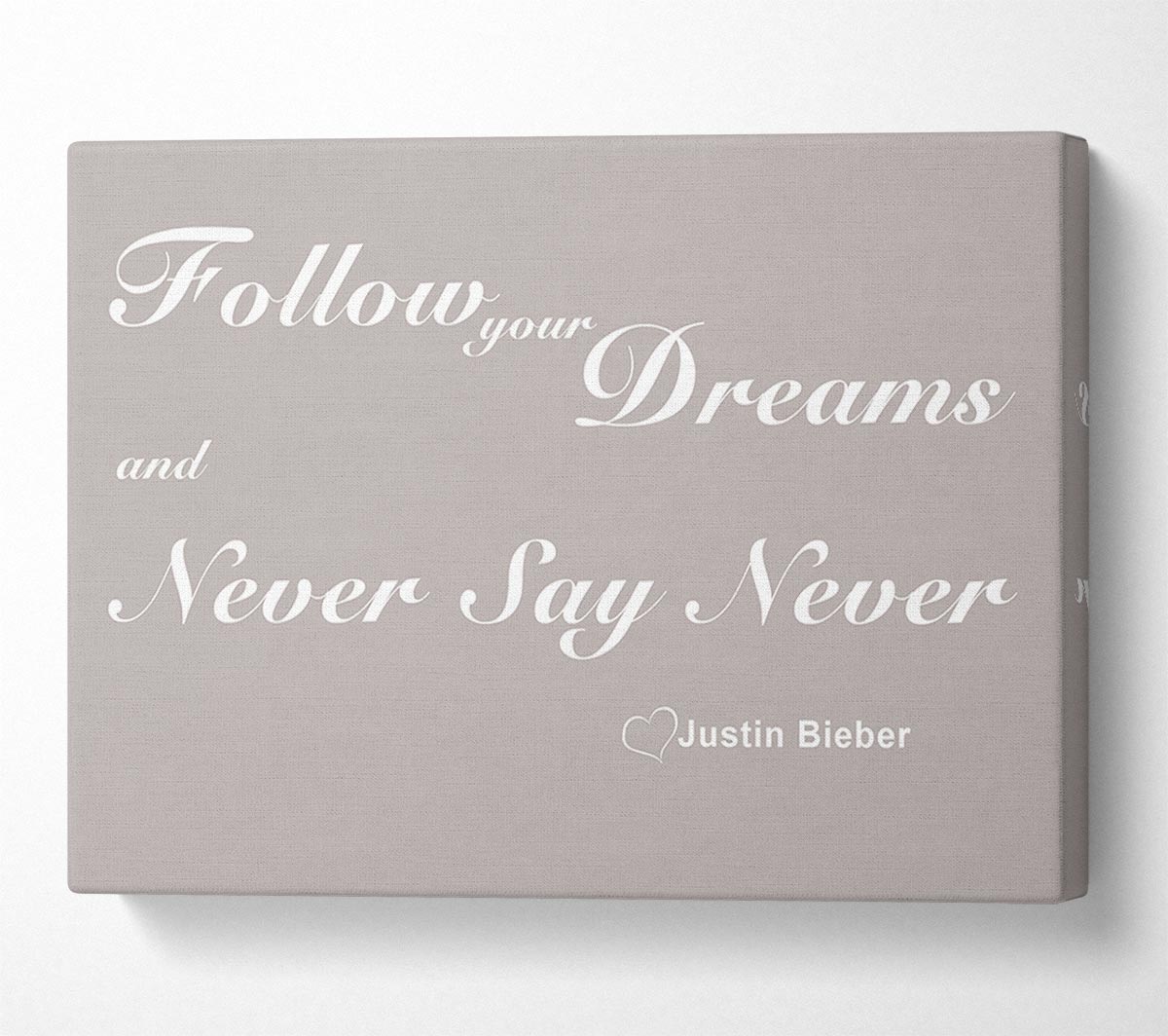 Music Quote Follow Your Dreams Justin Bieber Beige Canvas Print handmade in the UK. Stretched over a 2 inch thick wooden box frame, ready to hang on your wall.
