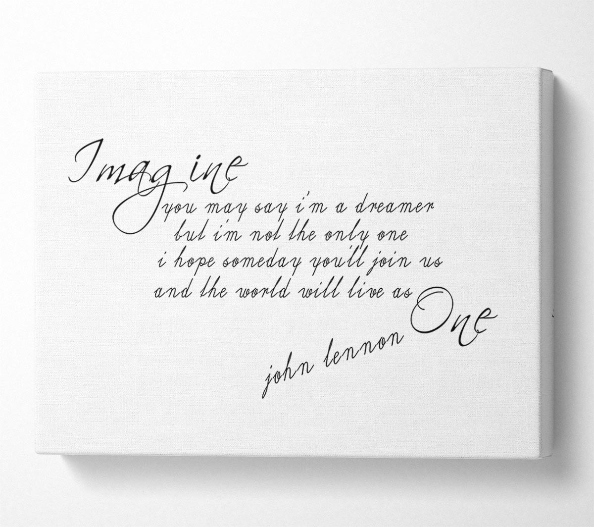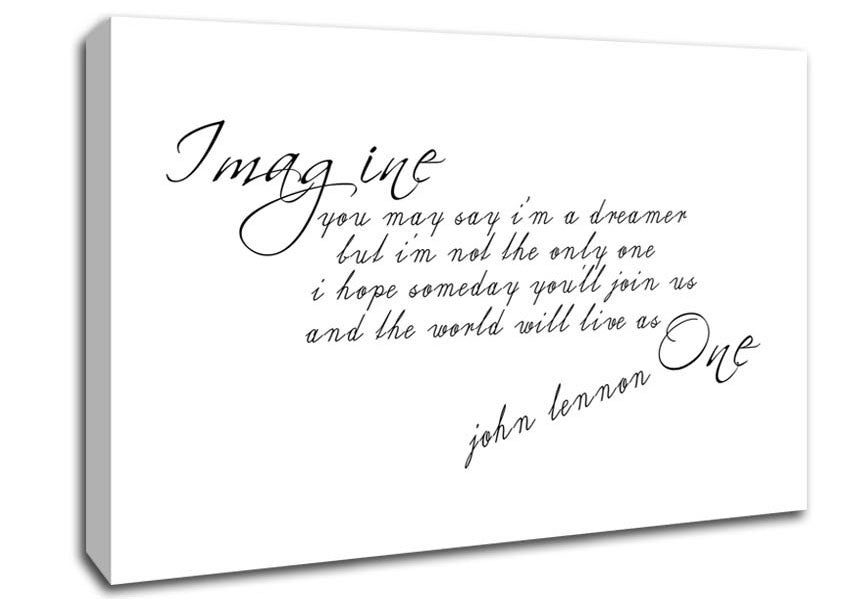 Music Quote Imagine John Lennon White Canvas Print handmade in the UK. Stretched over a 2 inch thick wooden box frame, ready to hang on your wall.