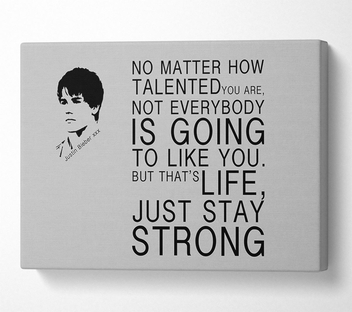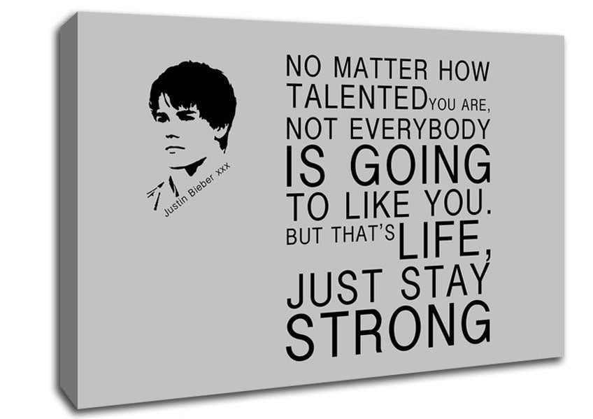 Music Quote No Matter How Talented Justin Bieber Grey Canvas Print handmade in the UK. Stretched over a 2 inch thick wooden box frame, ready to hang on your wall.