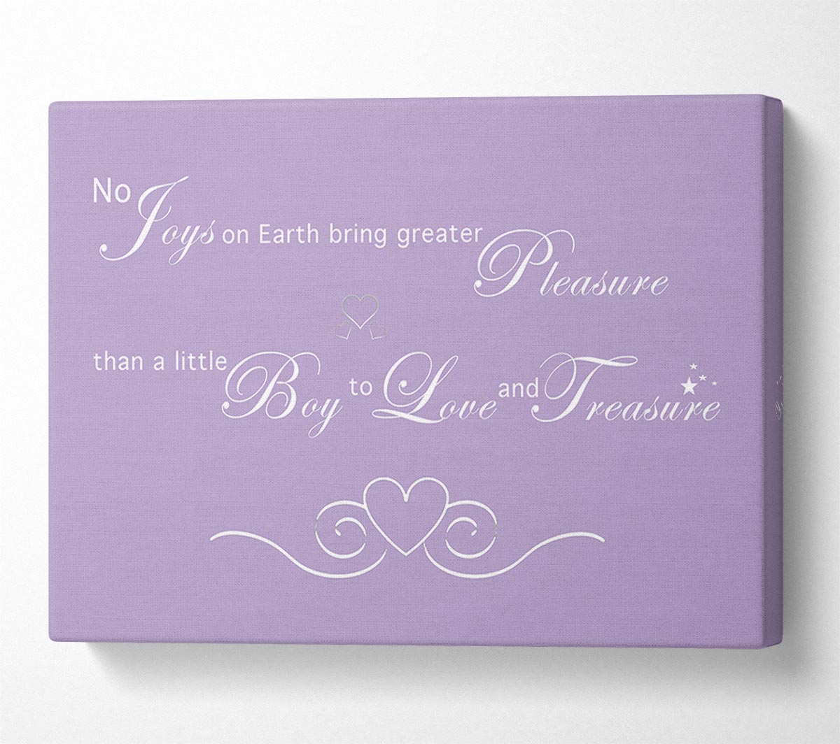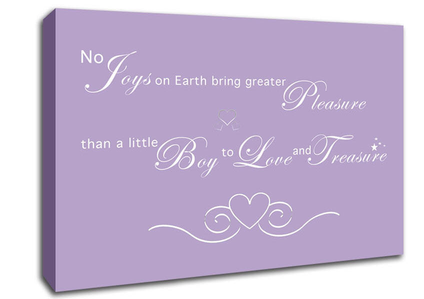 Nursery Quote No Joys On Earth Bring Pleasure Lilac Canvas Print handmade in the UK. Stretched over a 2 inch thick wooden box frame, ready to hang on your wall.