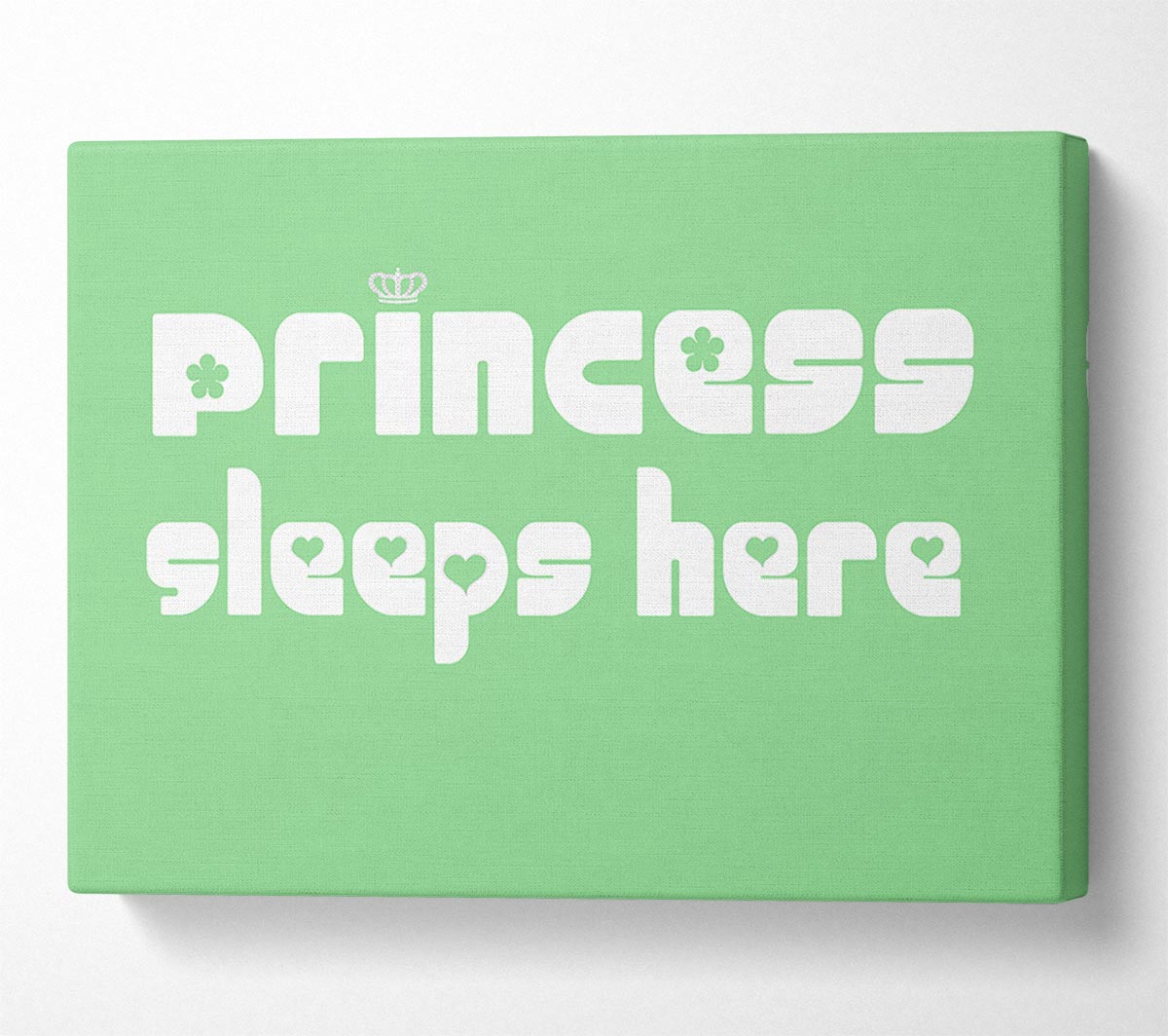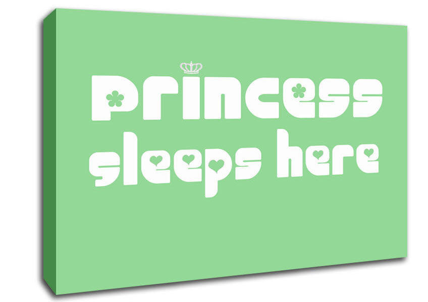 Nursery Quote Princess sleeps 2 Green Canvas Print handmade in the UK. Stretched over a 2 inch thick wooden box frame, ready to hang on your wall.