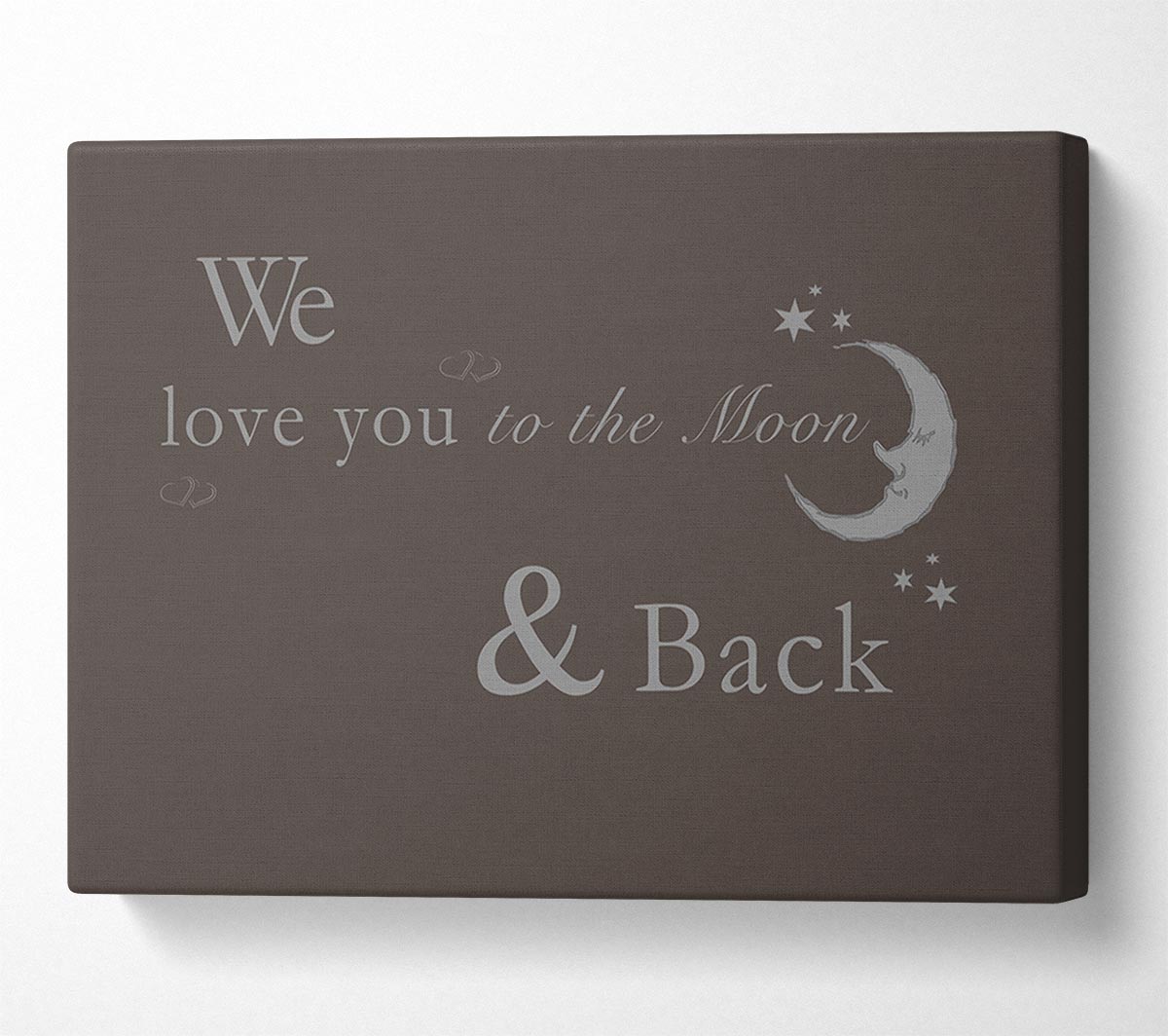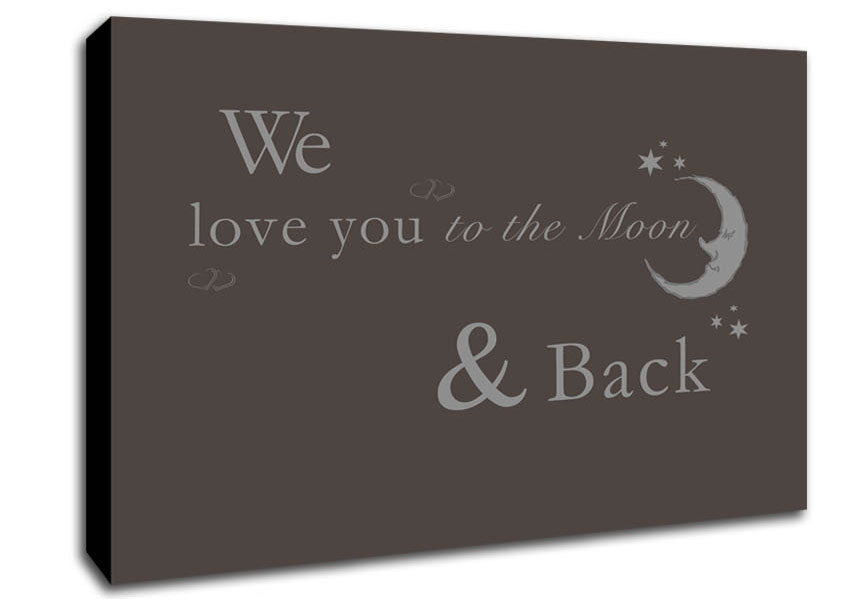 Nursery Quote We Love You To The Moon And Back 2 Chocolate Canvas Print handmade in the UK. Stretched over a 2 inch thick wooden box frame, ready to hang on your wall.