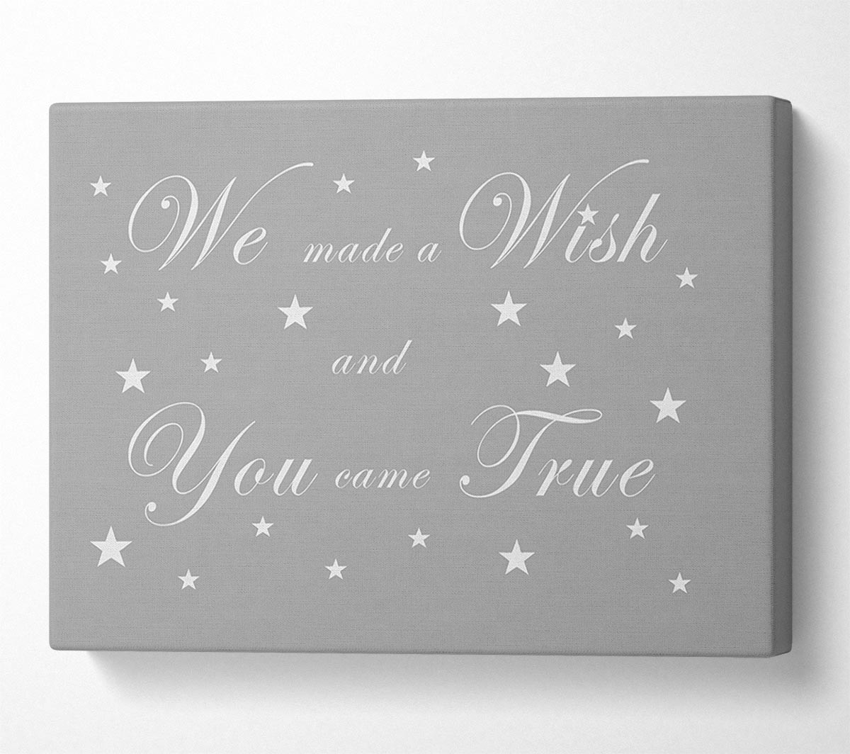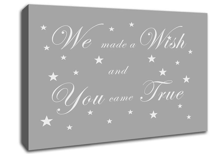 Nursery Quote We Made A Wish And You Came True Grey White Canvas Print handmade in the UK. Stretched over a 2 inch thick wooden box frame, ready to hang on your wall.