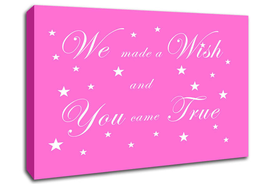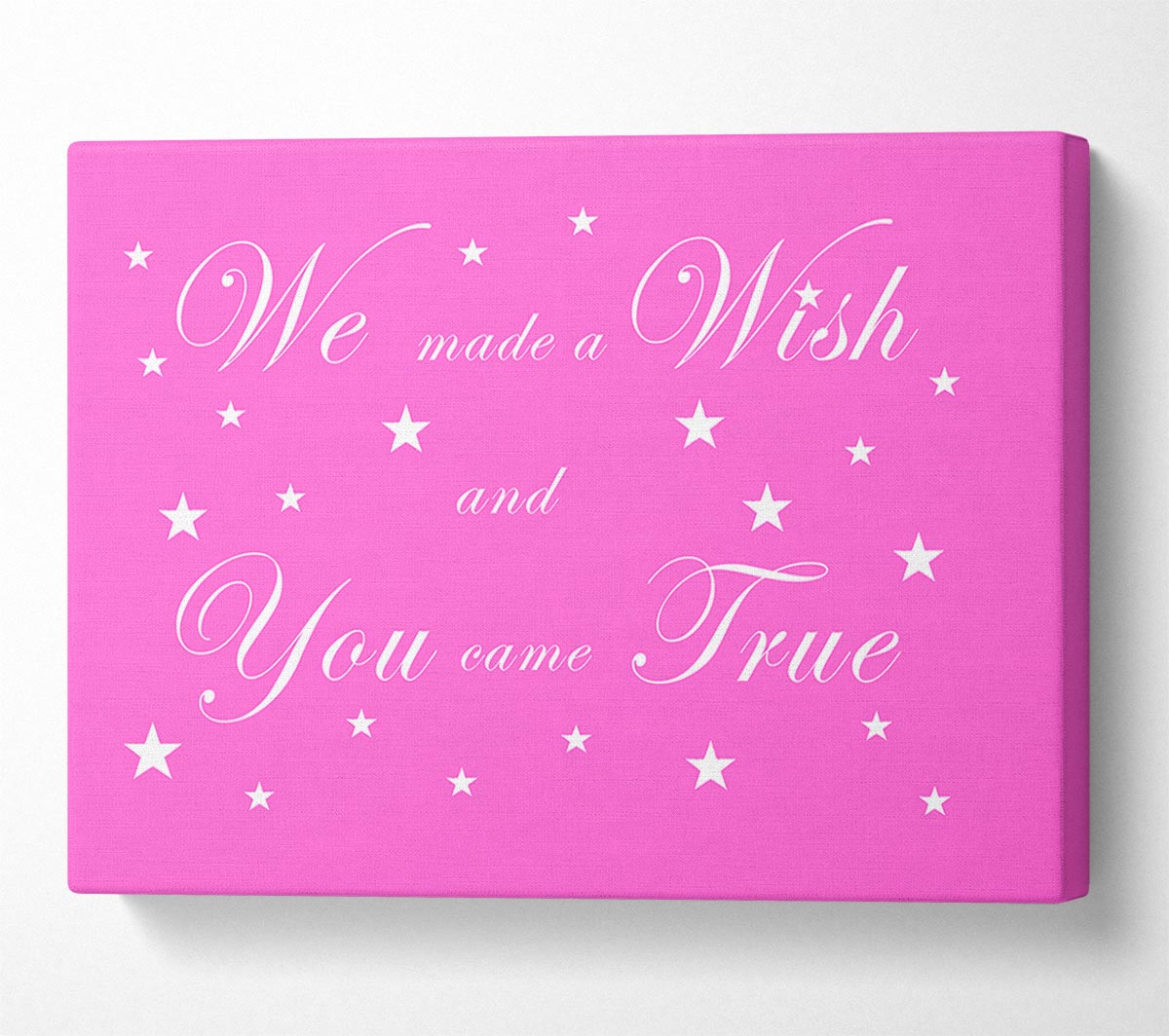 Nursery Quote We Made A Wish And You Came True Vivid Pink Canvas Print handmade in the UK. Stretched over a 2 inch thick wooden box frame, ready to hang on your wall.