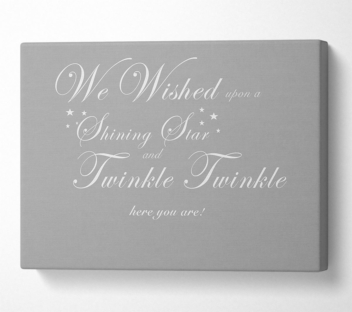 Nursery Quote We Wished Upon A Shining Star Grey White Canvas Print handmade in the UK. Stretched over a 2 inch thick wooden box frame, ready to hang on your wall.