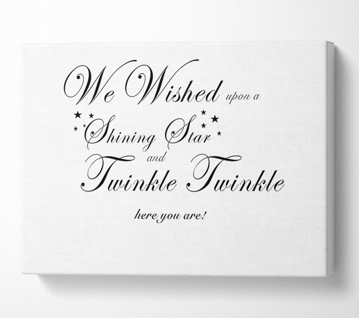 Nursery Quote We Wished Upon A Shining Star White Canvas Print handmade in the UK. Stretched over a 2 inch thick wooden box frame, ready to hang on your wall.