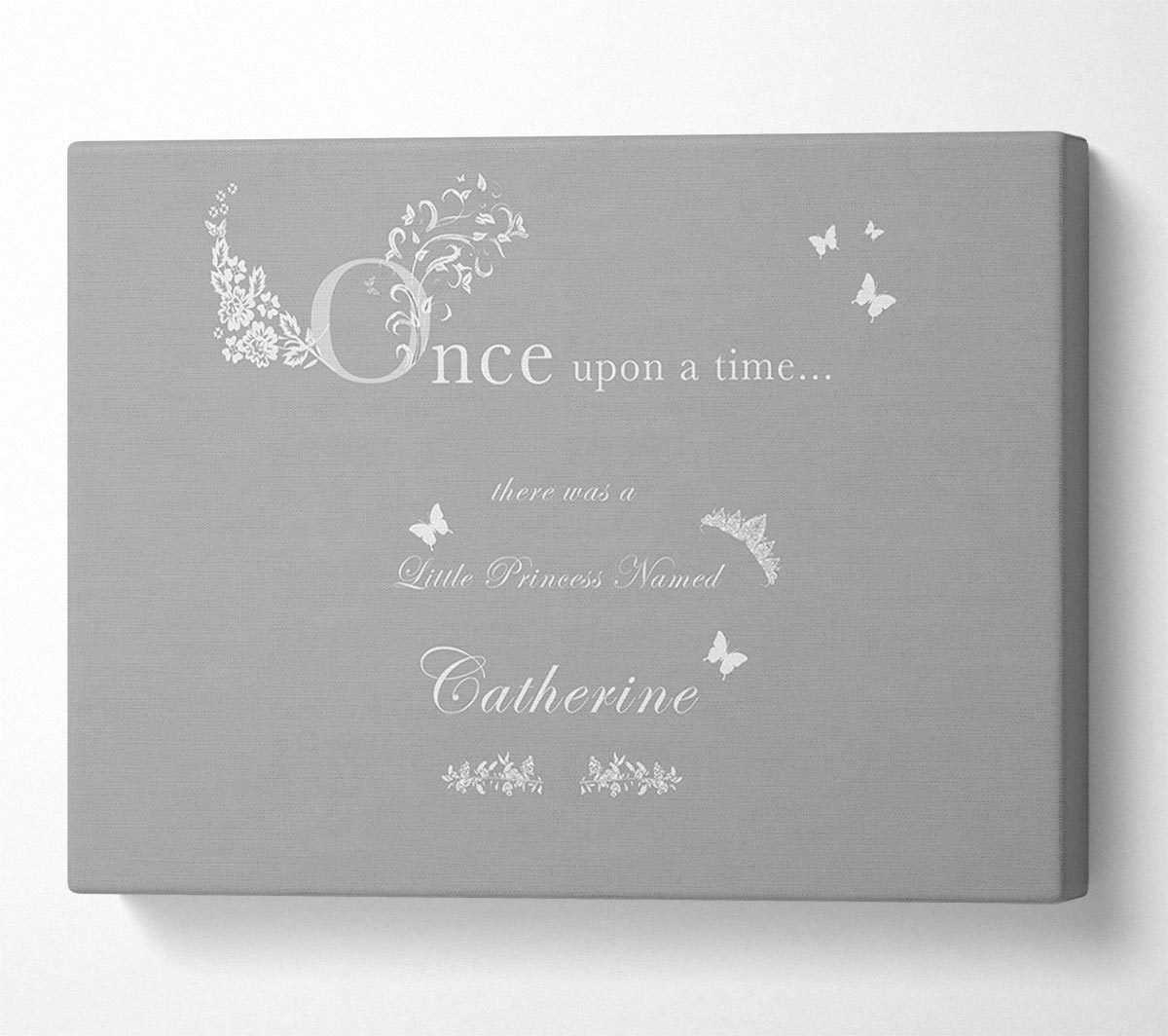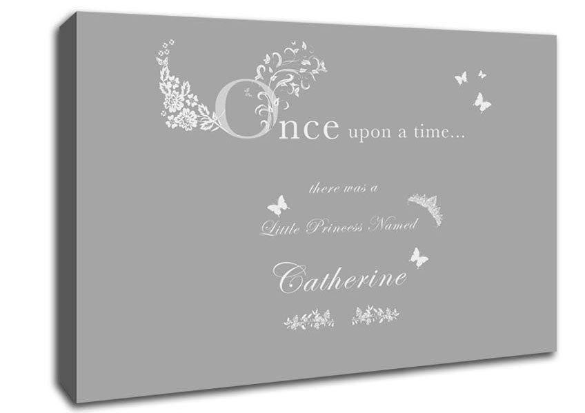 Once Upon A Time Your Name Grey White Canvas Print handmade in the UK. Stretched over a 2 inch thick wooden box frame, ready to hang on your wall.