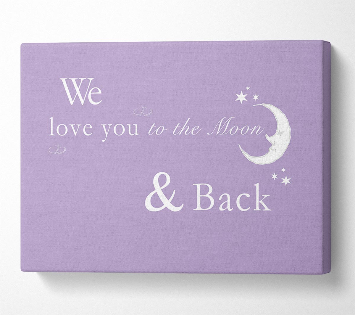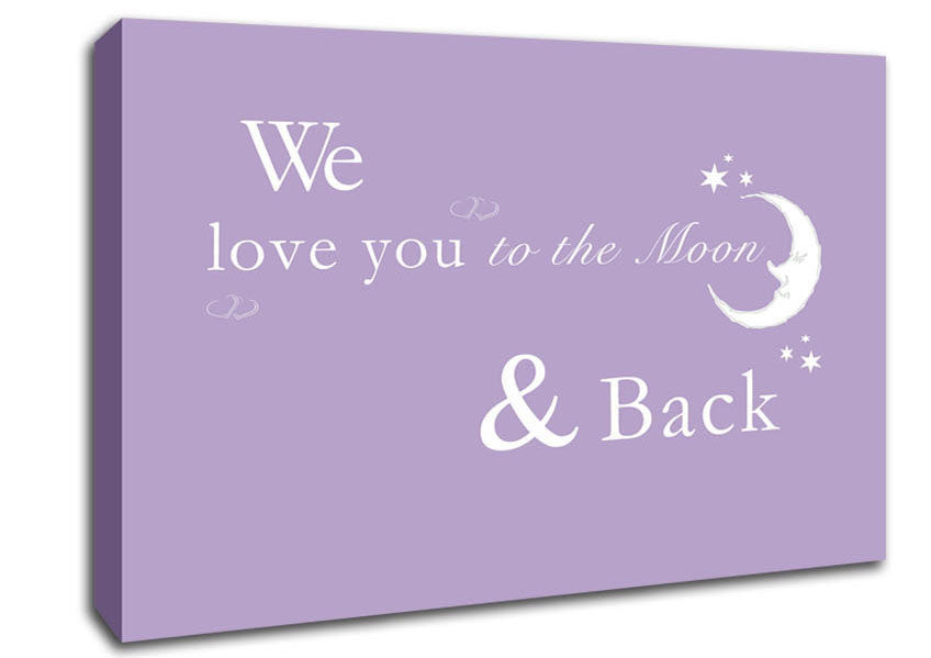 We Love You To The Moon And Back 2 Lilac Canvas Print handmade in the UK. Stretched over a 2 inch thick wooden box frame, ready to hang on your wall.