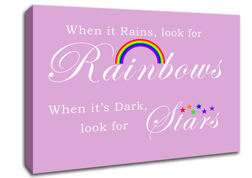 When It Rains Look For Rainbows 2 Pink Canvas Print handmade in the UK. Stretched over a 2 inch thick wooden box frame, ready to hang on your wall.