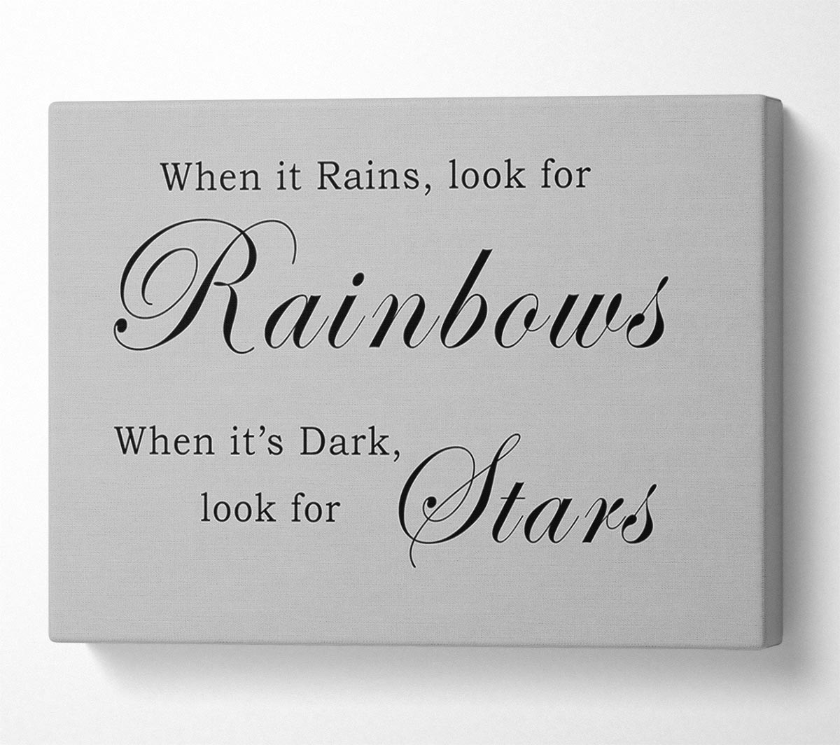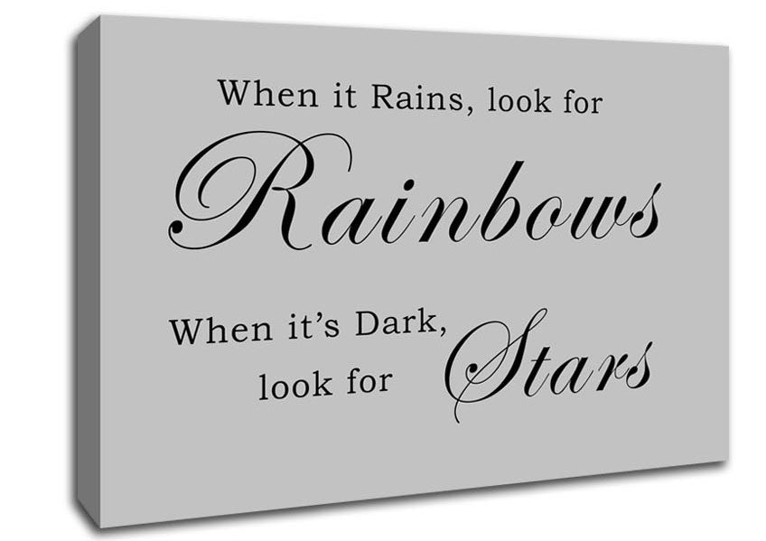 When It Rains Look For Rainbows Grey Canvas Print handmade in the UK. Stretched over a 2 inch thick wooden box frame, ready to hang on your wall.