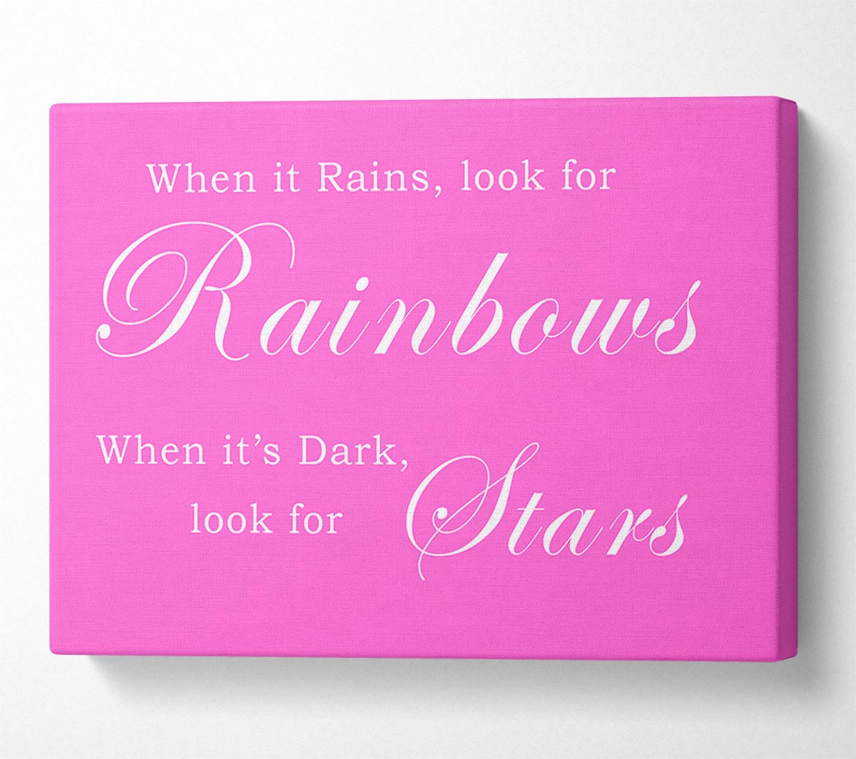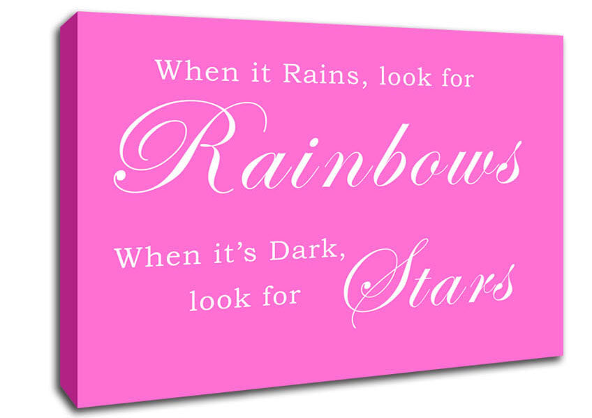 When It Rains Look For Rainbows Vivid Pink Canvas Print handmade in the UK. Stretched over a 2 inch thick wooden box frame, ready to hang on your wall.